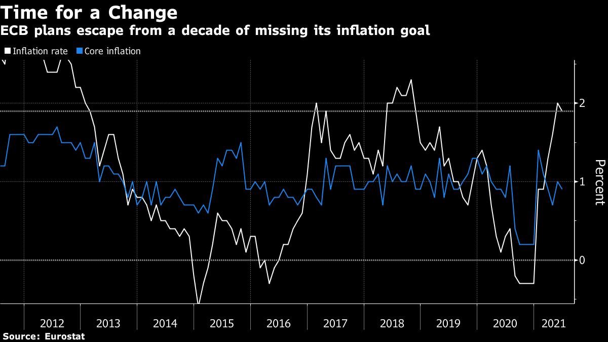 上周欧洲央行宣布其长期战略审查结果时,法兰克福的官员表示,他们更简单的方法“可能也意味着通货膨胀在目标之上的温和时期。” 官员们决定放弃他们过去的“低于但接近2%”的通货膨胀目标,这被视为模糊,并且是在过度的价格压力是主要关注点而不是相反的情况下起草的。欧洲央行行长拉加德告诉彭博电视,新的通货膨胀目标“可能需要更长一点时间”才能实现。