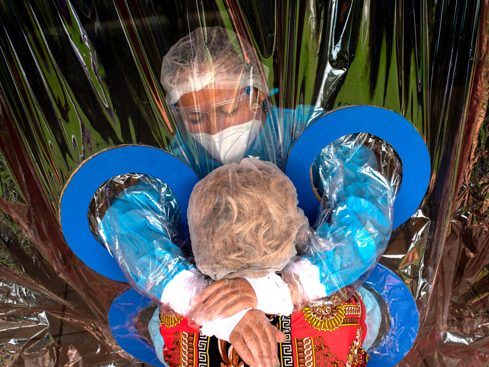 亲属透过透明帘子在圣萨尔瓦多的养老院里拥抱。摄影师:YURI CORTEZ/AFP### 你应该阅读的内容