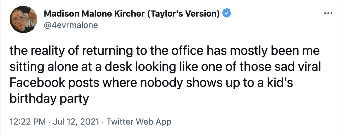 如果您,亲爱的读者,在回来后注意到办公室生活发生了变化,给我发一封电子邮件。是否有更多隔音舱?指定的“Zoom会议室”?您是否在不同的空间中工作?更多的会议在室外进行?让我知道看起来有什么不同,以及它如何改变了办公工作的体验。