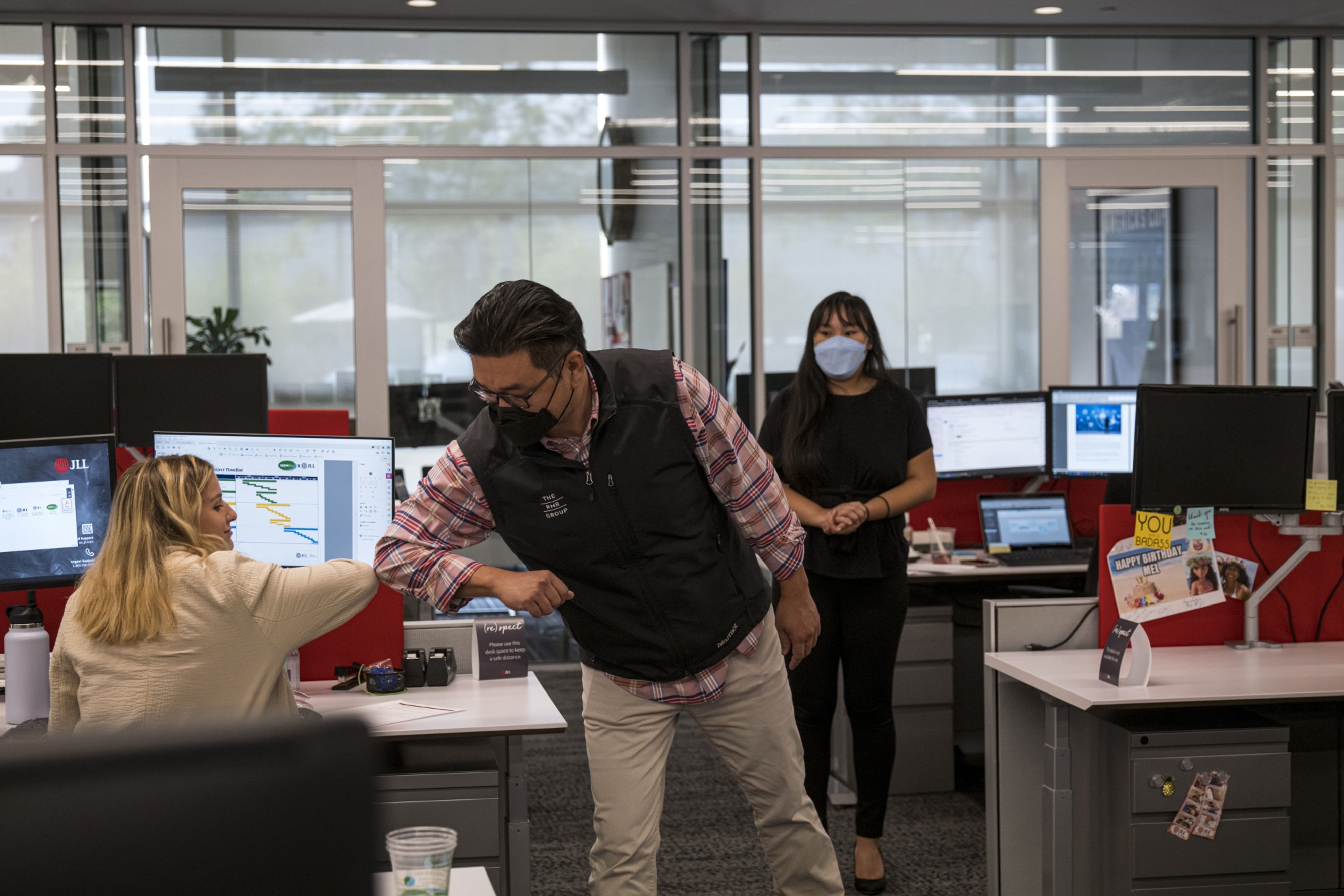 员工们戴着防护口罩在加利福尼亚门洛帕克的JLL办公室肘部碰撞,时间是2020年9月15日星期二。