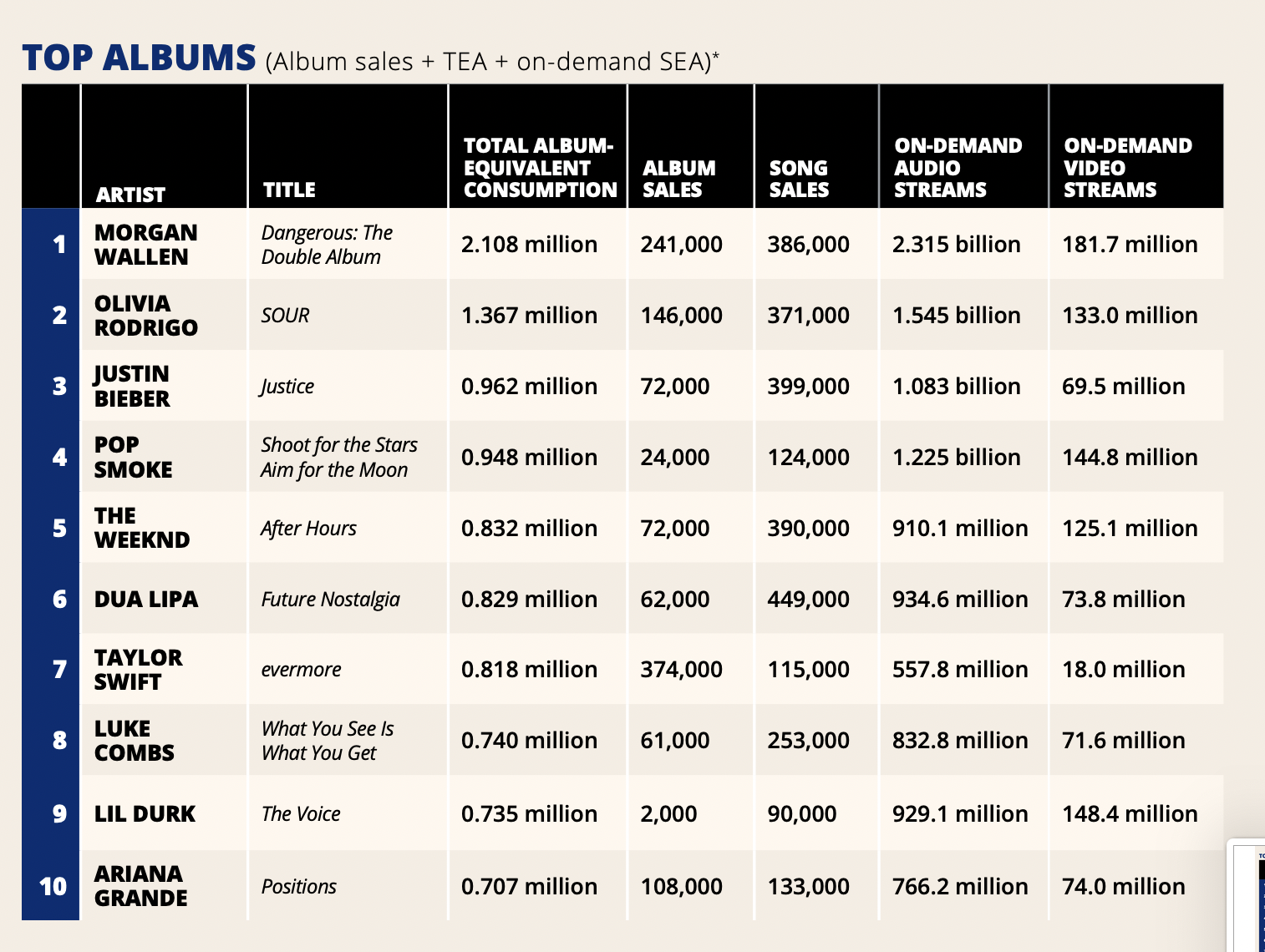 Morgan Wallen的《Dangerous》。这位乡村音乐歌手的最新专辑已售出210万份(包括流媒体),超过了Olivia Rodrigo的《Sour》,夺得榜首。这两张专辑是唯一超过100万销量的。这只是在美国,由MRC Data测量。