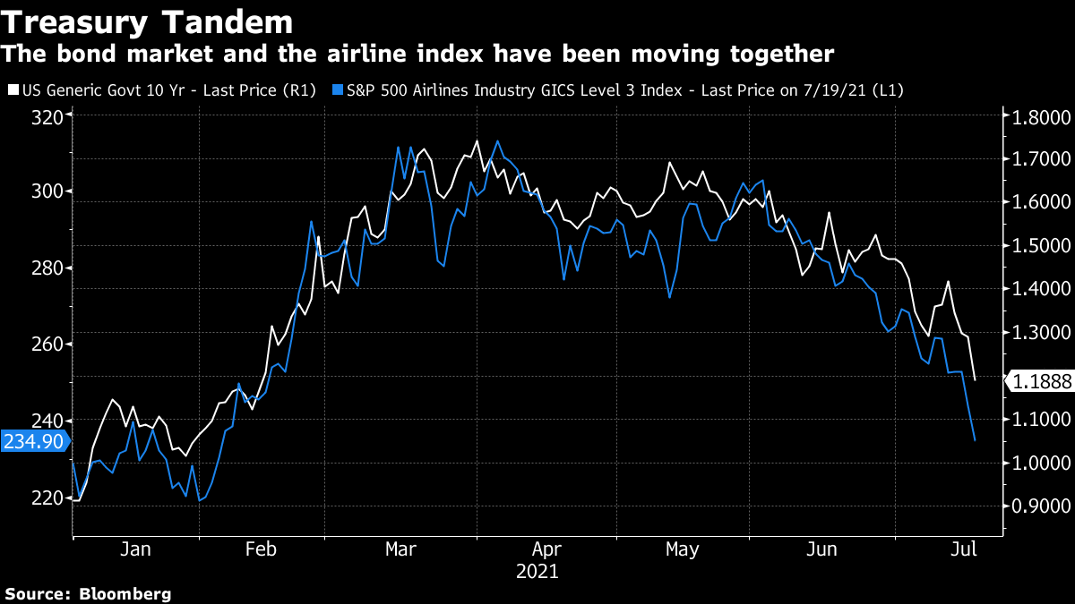 随着德尔塔冠状病毒变种的传播引发人们对经济复苏的韧性产生担忧,并支撑避险资产,全球股市抛售在亚洲将继续。日本、澳大利亚和香港的期货跌约1%。周期性公司遭受了暴跌的冲击,逆转了复苏交易。商品、金融和工业股在标普500指数中领跌,该指数两个月来跌幅最大。长期国债收益率螺旋式下降至2月份以来的最低水平,债券收益率曲线趋平。十年期收益率周一下跌多达12个基点,至1.17%。美元与日元和瑞士法郎齐涨。石油价格下跌,因为OPEC+同意将供应增加到2022年。比特币跌至接近30000美元。