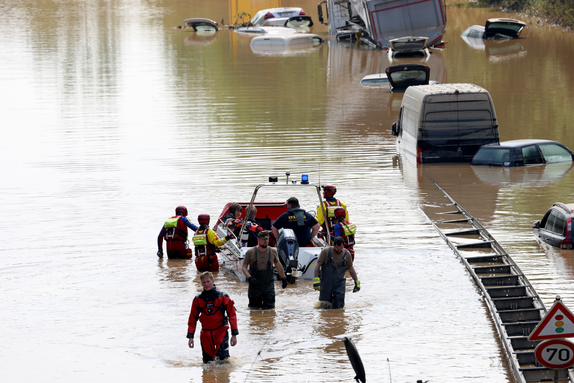 救援队在德国Erftstadt的一条被洪水淹没的高速公路上寻找受害者。