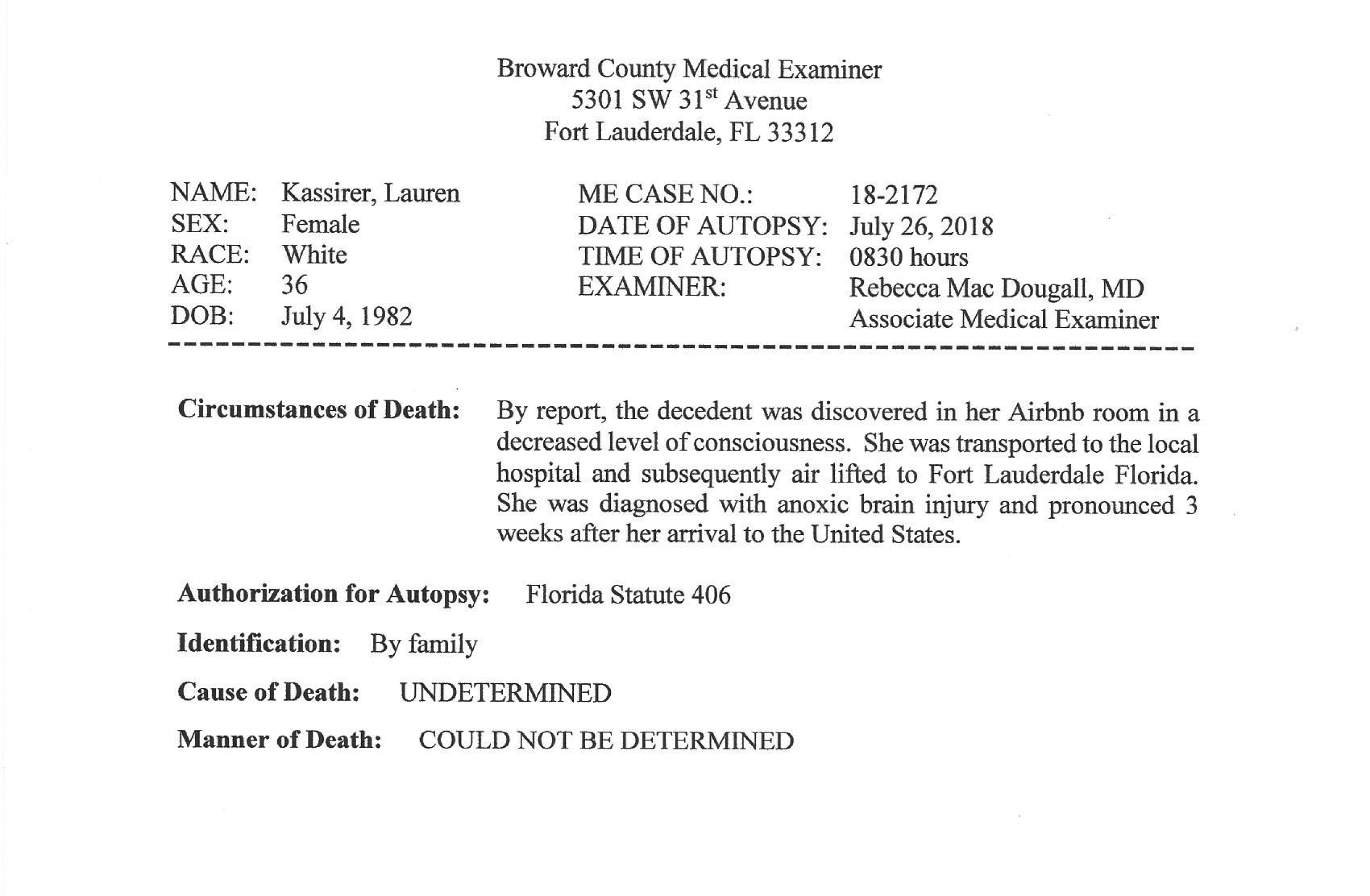 勃罗沃德县医学检查官的报告将劳伦·卡西勒的死因和方式列为“不明确”。来源:勃罗沃德县医学检查官勃罗沃德县医学检查官丽贝卡·麦克道格尔在尸检报告中将劳伦·卡西勒的死因和方式列为“不明确”。麦克道格尔指出,在墨西哥拍摄的照片上看到的伤口已经愈合,医疗记录的审查未发现严重伤势。“这并不排除遭受袭击的可能性,”她写道,“但事件发生与她死亡之间的时间差、关于事件情况的信息不足、没有现场调查以及没有可供测试的标本,使得无法完整地了解在墨西哥到底发生了什么。”