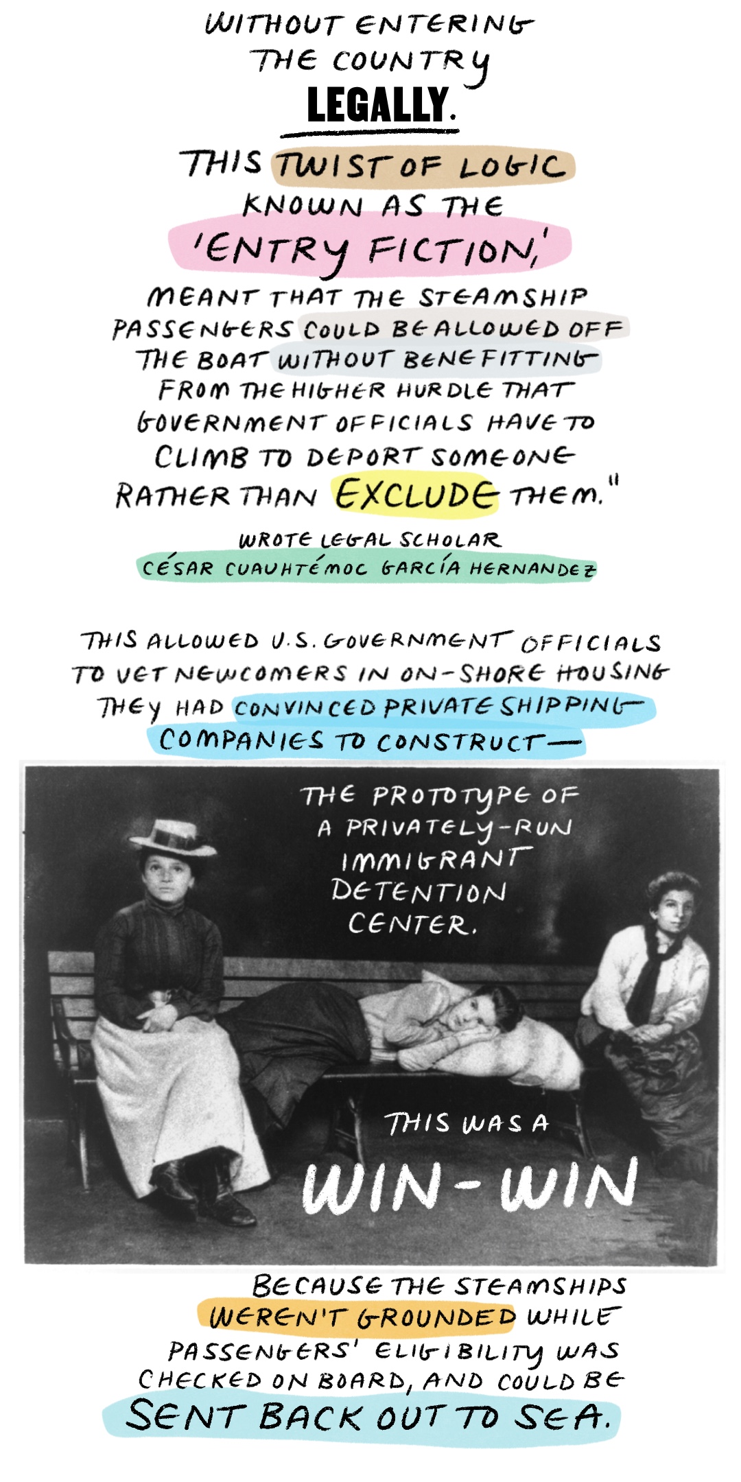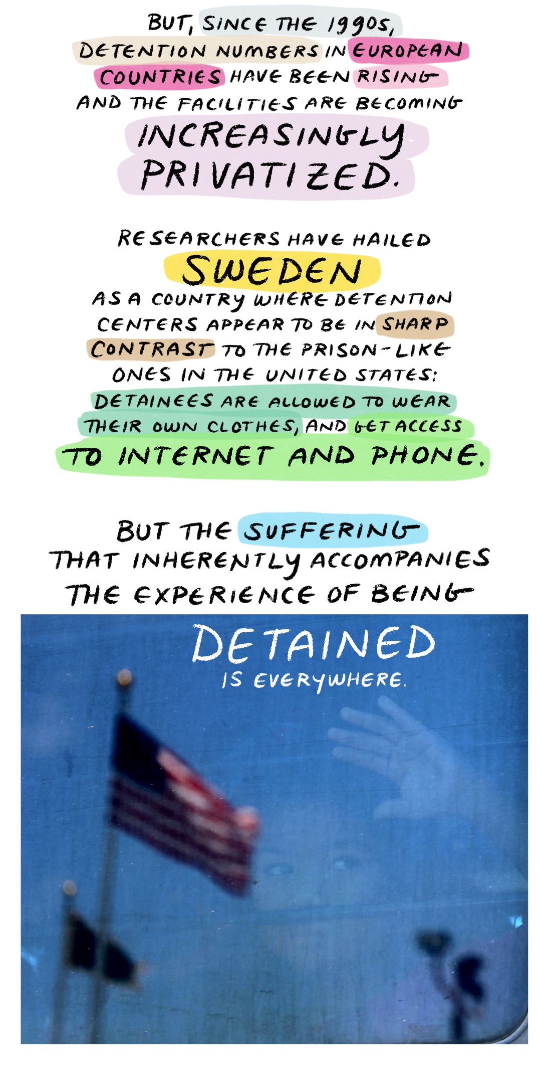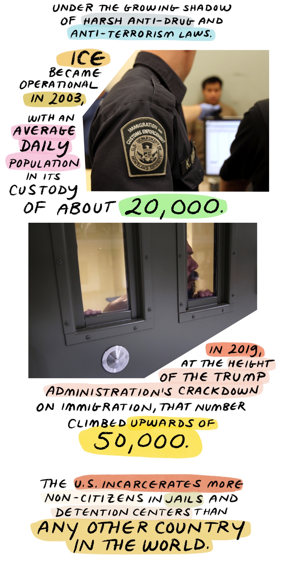 拘留的目的是为了解决后勤问题 — 一种拘留涉嫌犯有民事边境相关罪行的人的方式。但拘留本质上是惩罚性的。随着移民执法机构的扩大成为今天的庞然大物,它影响到越来越多的人。