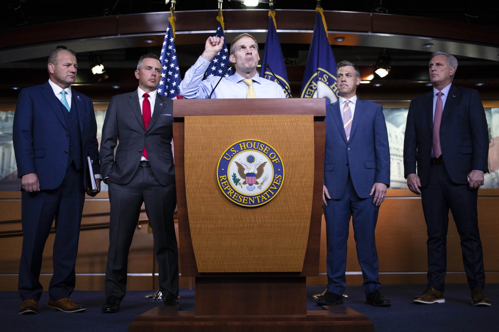共和党众议员吉姆·乔丹(中间,不穿夹克)是众议院议长南希·佩洛西拒绝参加调查1月6日国会大厦暴动委员会的两名男子之一。摄影师:汤姆·布伦纳/彭博社美联储主席杰罗姆·鲍威尔据报道在白宫高级顾问中获得了广泛支持,尽管预计今年晚些时候将做出决定。鲍威尔的任期将于2月结束。