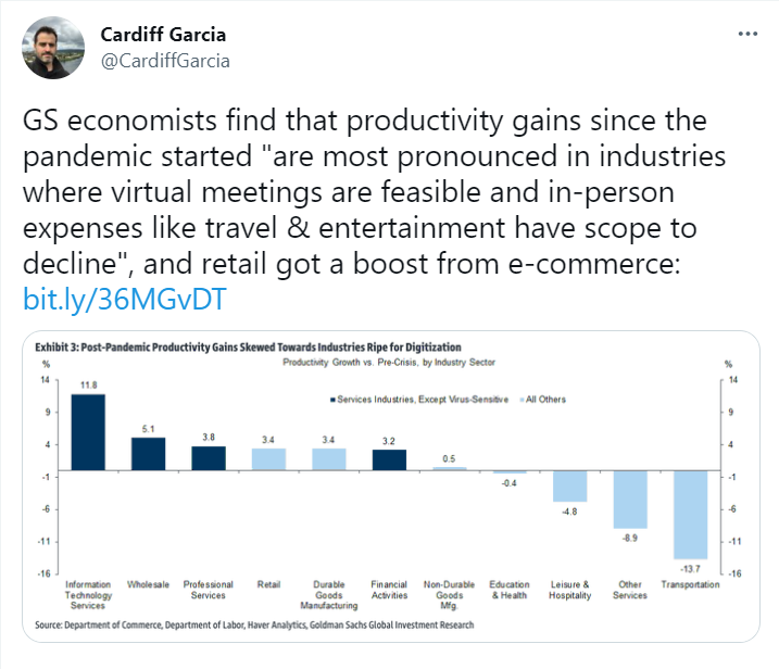 在疫情造成的经济损失中的一线希望是它如何改变了各行业的生产力。