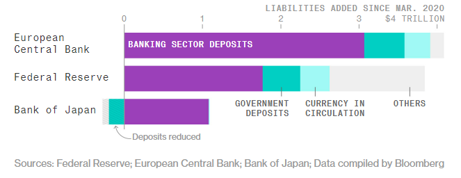 彭博新闻最近对美联储、欧洲央行和日本央行史无前例的9万亿美元疫情资产购买狂潮进行了探讨,发现其中很大一部分最终以银行部门存款的形式回到了中央银行。根据摩根士丹利策略师马修·霍恩巴赫在7月19日的一份报告中对过去一年美国货币供应大幅增加的情况进行分析,以评估这是否导致通胀。他19页报告的简短摘要是:可能不会。以下是他的一些理由: