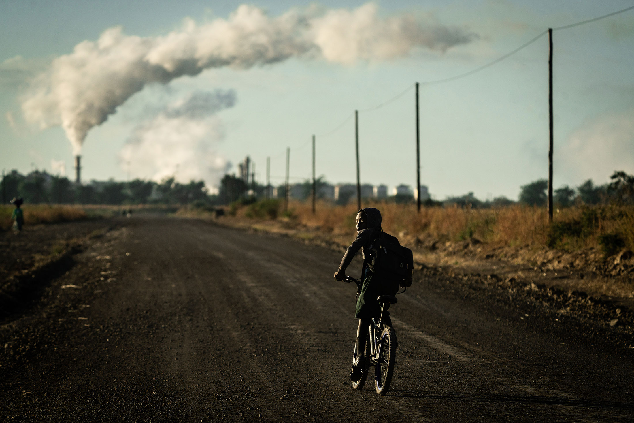 一名孩子骑自行车去一所靠近工厂的学校。2015年的一份议会报告指出,有15起涉及儿童和运输甘蔗的卡车的致命碰撞事故。摄影师:Zinyange Auntony
