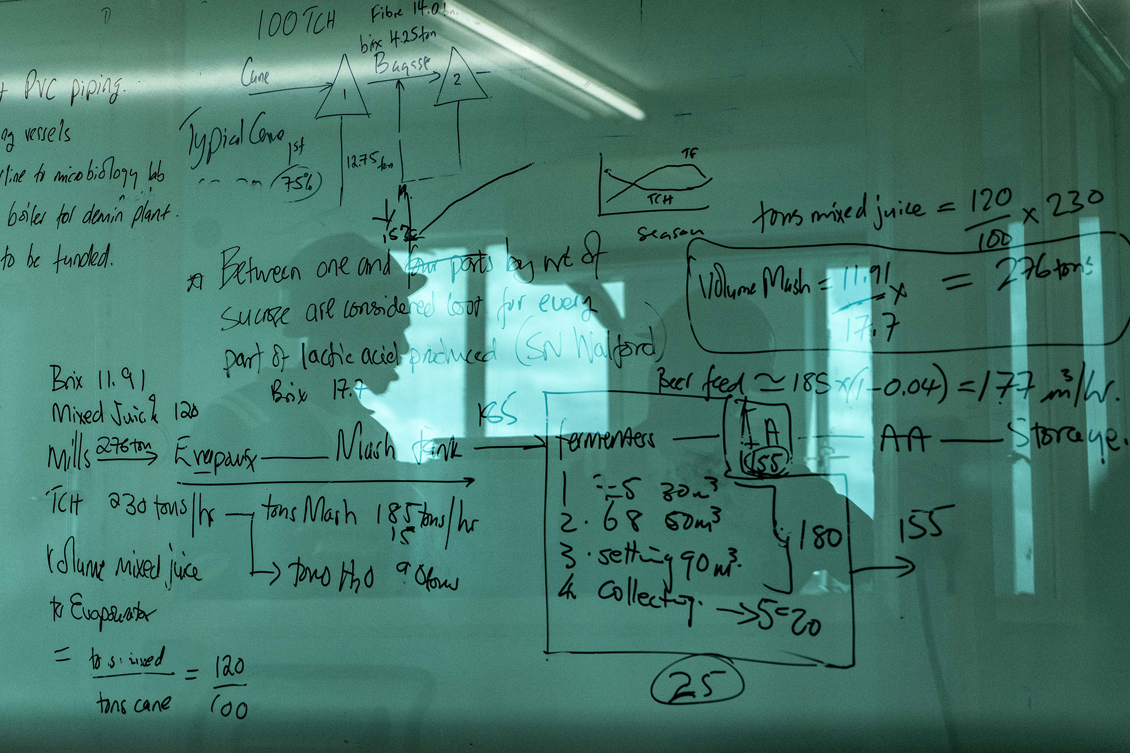 实验室工作者在工厂白板的倒影中。津巴布韦近年来每天停电超过18小时。绿色燃料从焚烧废物中产生的18兆瓦电力可以为约18,000户家庭供电。摄影师:Zinyange Auntony