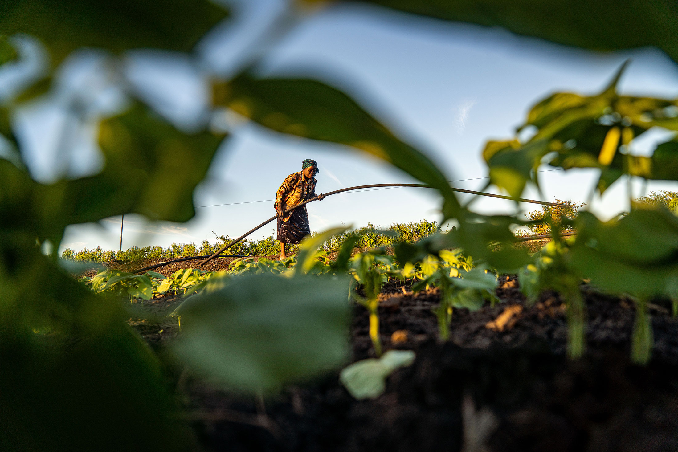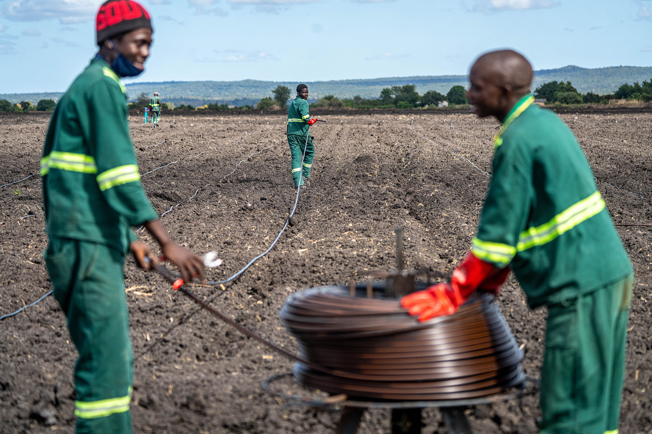 绿色燃料公司的工人正在安装社区灌溉系统,这有助于提高一个缺水地区农民的作物产量。