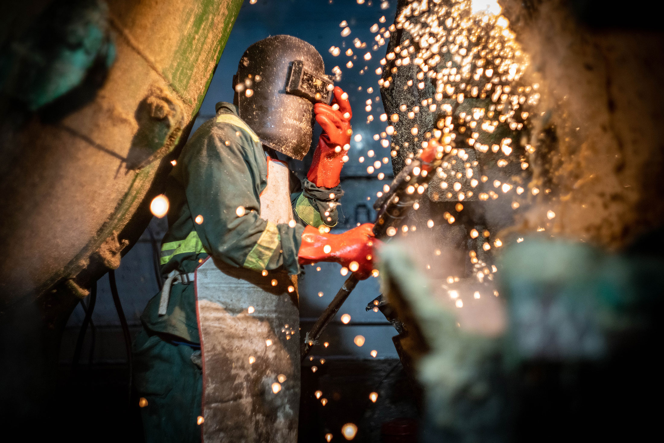 William Chorwadza,53岁,自2010年以来一直在绿色燃料公司担任焊工。该公司旨在将乙醇产量扩大到每月1100万升。摄影师:Zinyange Auntony