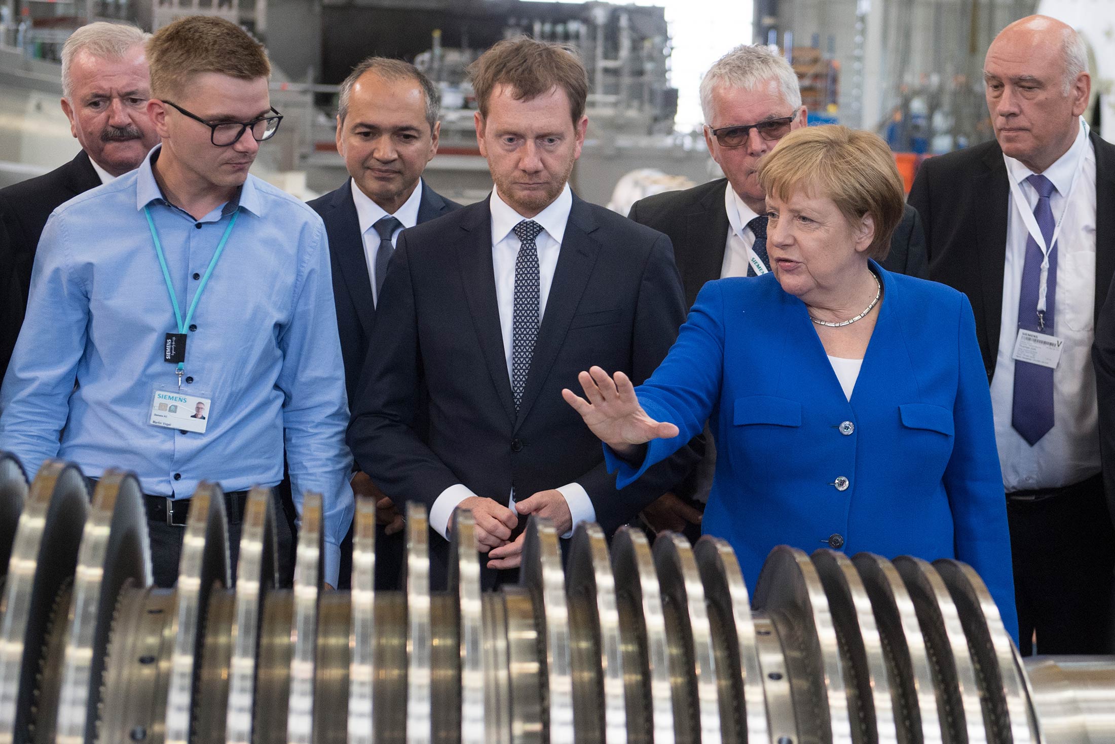 默克尔在2019年7月15日与萨克森州州长迈克尔·克雷切默(Merkel tours a Siemens plant in Görlitz, Saxony, with State Premier Michael Kretschmer, a member of Merkel’s CDU party)参观了戈尔利茨的西门子工厂。摄影:塞巴斯蒂安·卡纳特/德国新闻社与此同时,越来越多像巴克森(Backsen)一样思考的选民对日益明显的气候变化迹象感到不安。连续酷热的夏天烧焦了庄稼,引发了前所未有的森林大火。另一方面,气候变暖加剧了风暴,导致了造成至少170人死亡的西德地区的灾难性洪水。默克尔在参观受灾地区时表示,她认识到德国需要加大行动应对全球变暖。“投资于气候保护是昂贵的,”她说,“但不早点做这件事证明会更加昂贵。”她所看到的就是证明。她说:“这是令人恐惧的,德语中没有可以描述我们所看到的破坏的词语。”