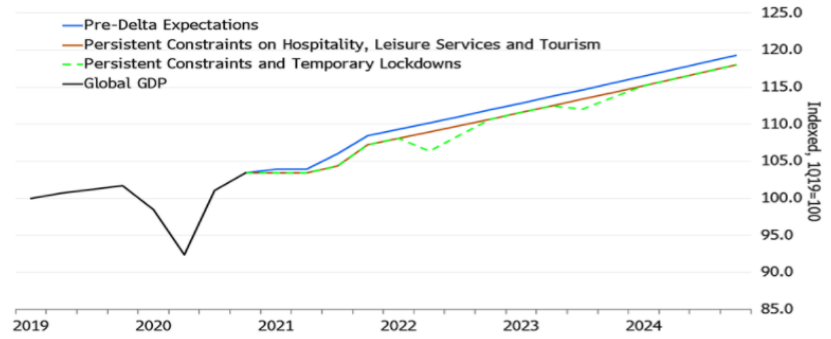 据彭博经济学称,德尔塔变种的迅速传播给全球前景增加了新的风险。在北美和欧洲,疫苗接种计划进展顺利,威胁是复苏进程更为漫长,而在亚洲,疫苗接种滞后,重新实施封锁措施可能导致经济增长受到更严重打击,他们写道。