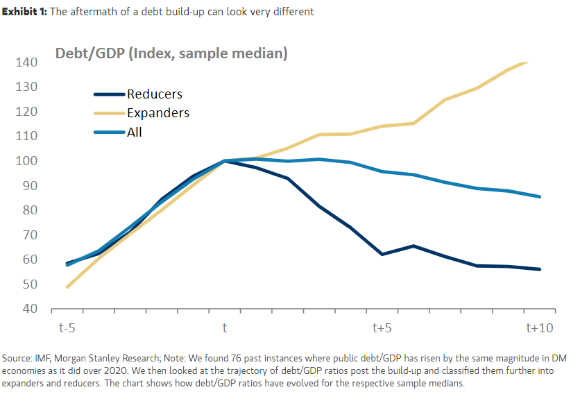 分析师发现,那些最终略微减少债务的国家“有点违反直觉地……在比债务扩张者更长的时间内保持扩张性的货币和财政政策。”“他们只有在经济达到自我维持路径之后才改变方向。更强大的增长基础和适度的通货膨胀为一个良性循环奠定了基础,最终产生了更低的债务比率。”