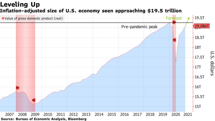 大规模接种疫苗和刺激支票的发放帮助推动了六月份的三个月内消费支出创下有记录以来最大的增长,如果经济学家的预测准确的话,国内生产总值将超过疫情前的记录。企业投资可能进一步支撑了经济的复苏。