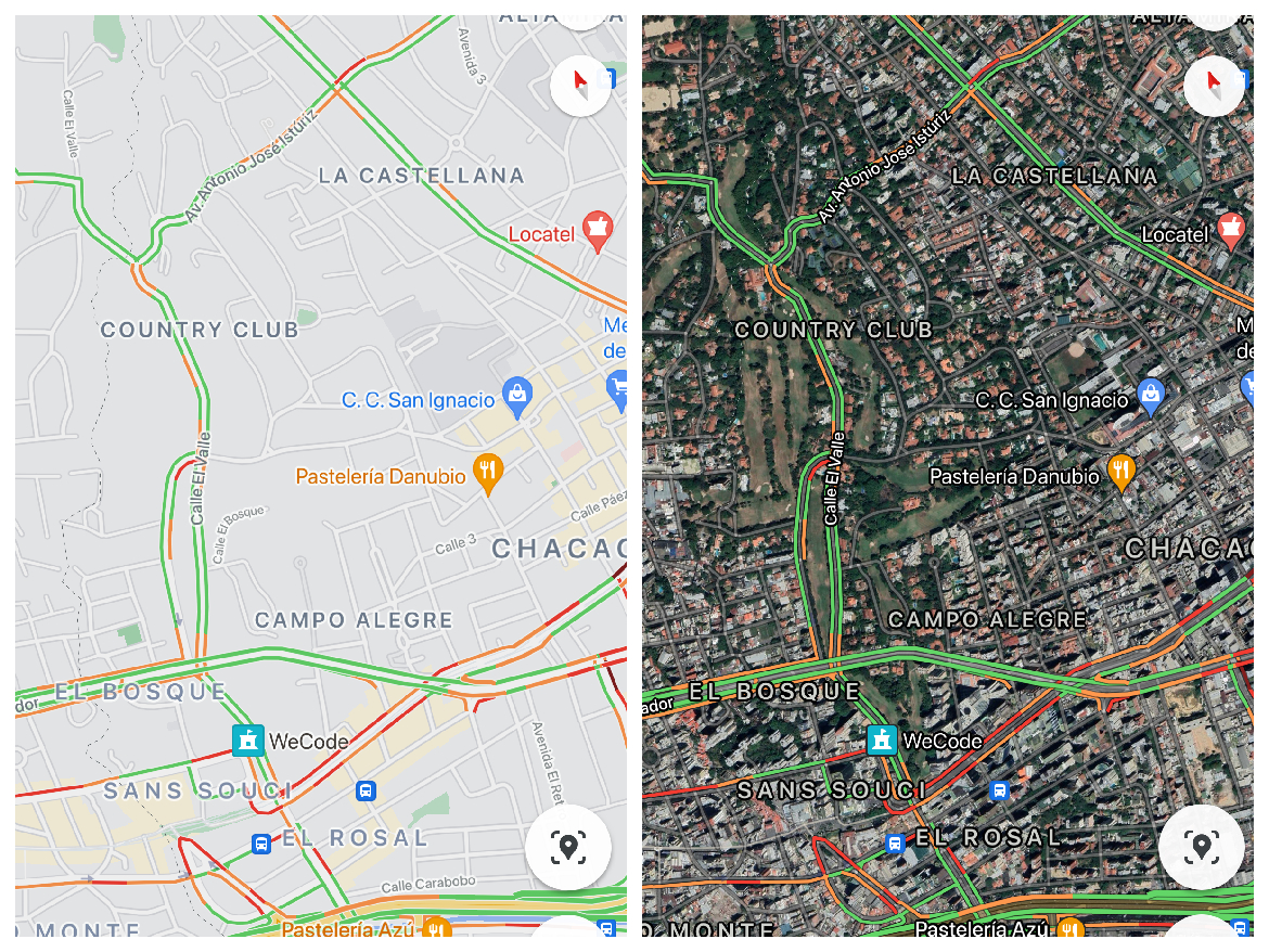 在Google地图上比较加拉加斯佩塔雷社区的地图和卫星图像,展示了这两种对社区的描述有何不同。