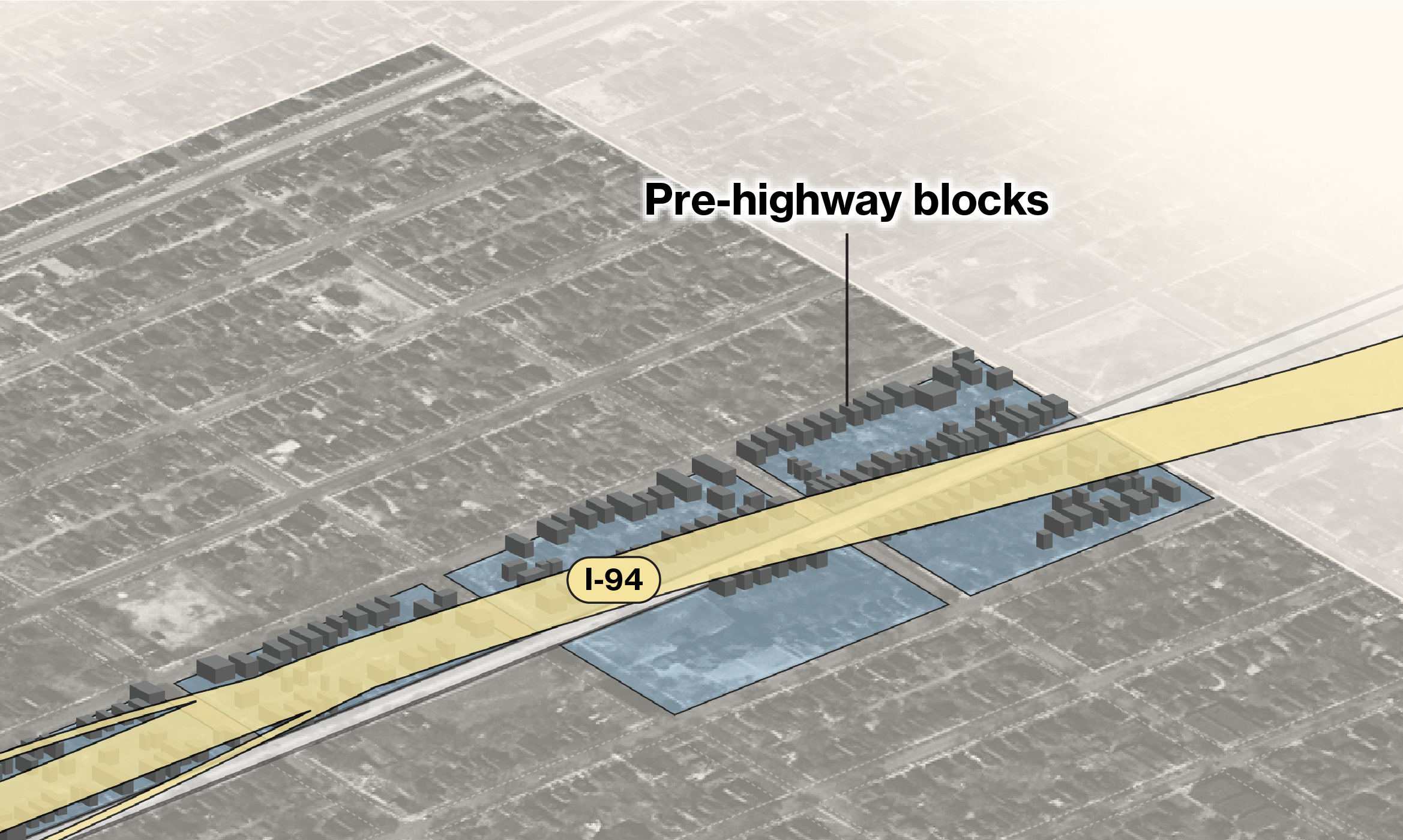 在明尼苏达州圣保罗,1960年代修建时,I-94穿过了主要是黑人社区的龙多。彭博新闻* 通过地图、数据和历史图片,彭博的Rachel Dottle、Pablo Robles和我研究了四种不同的想法,以重新连接被高速公路分隔的美国城市。(彭博城市实验室)