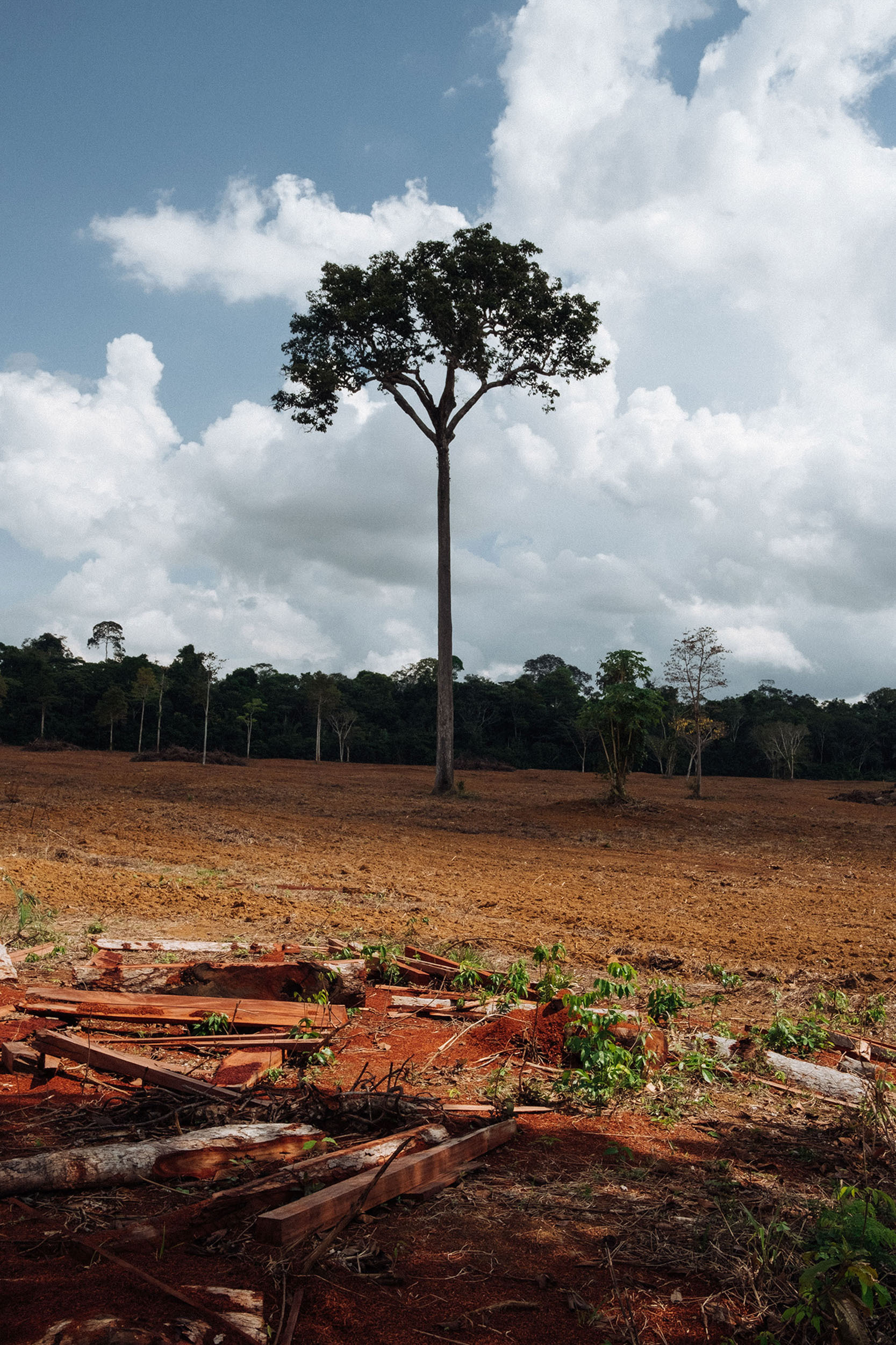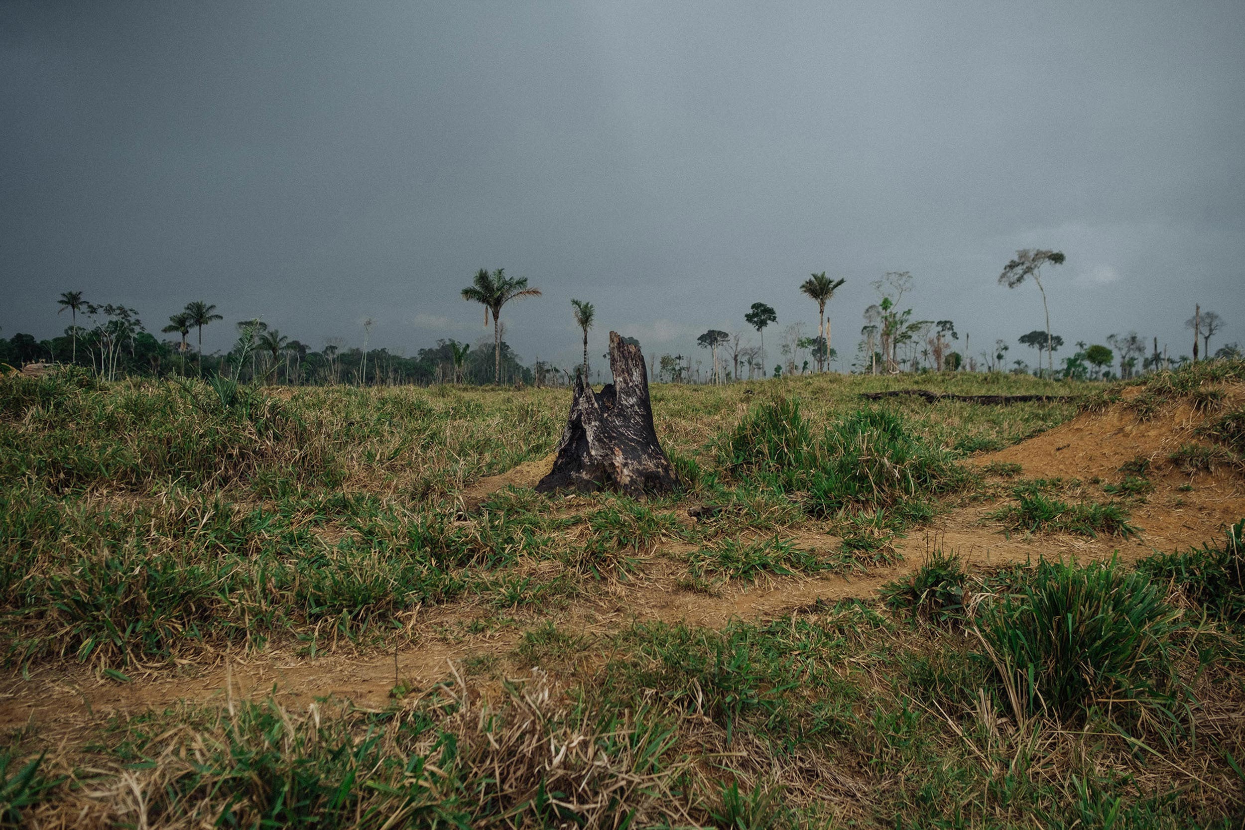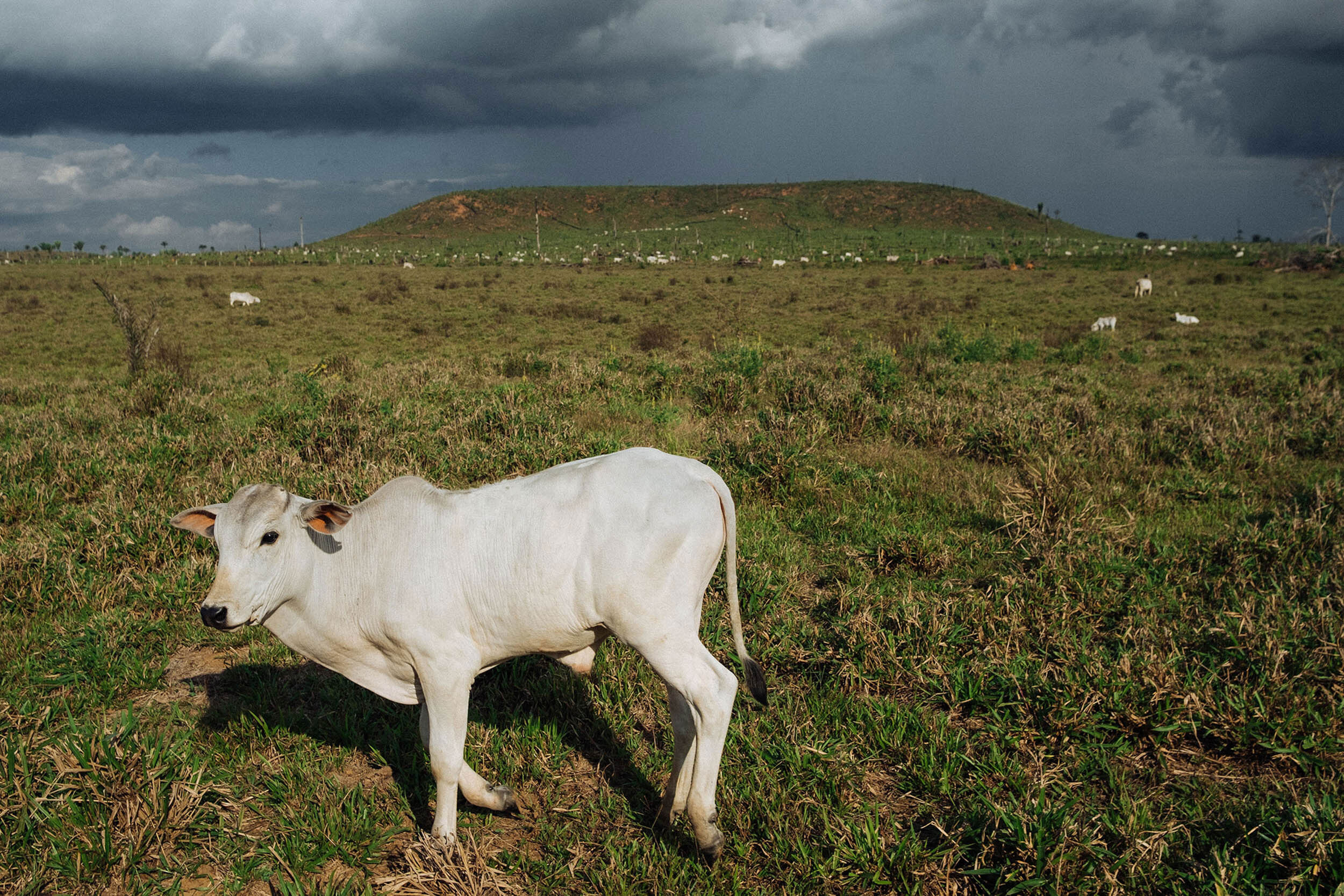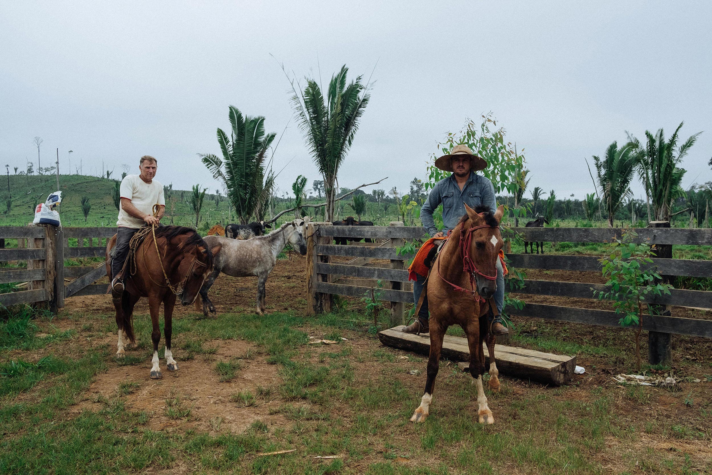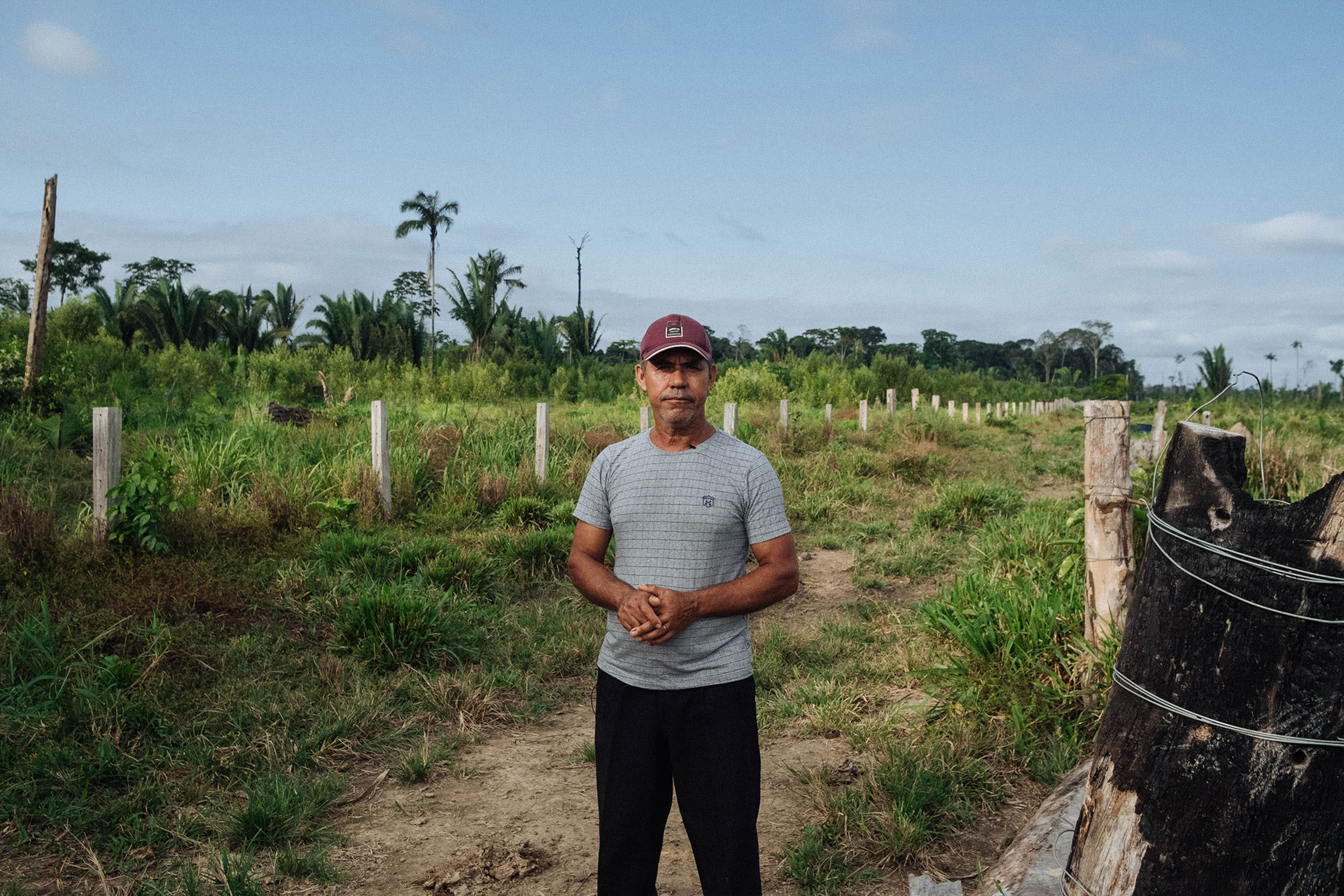 埃弗拉多·潘多尔菲坐在一匹棕色马上,位于两条土路交汇处,看着他的儿子在一个有围栏的地块里照料牛。潘多尔菲指着他面前一片广阔的田地说:“那全都是他的了”,那里仍然有被烧毁的树桩的锯齿状牙齿从高草中伸出。在他身后是他转让给女儿的一块地;在他左边是他另一个儿子拥有的一片田地。加在一起,它们总共超过200公顷。“以前这里是纯雨林,”他说。“我把它全部砍掉了。”
