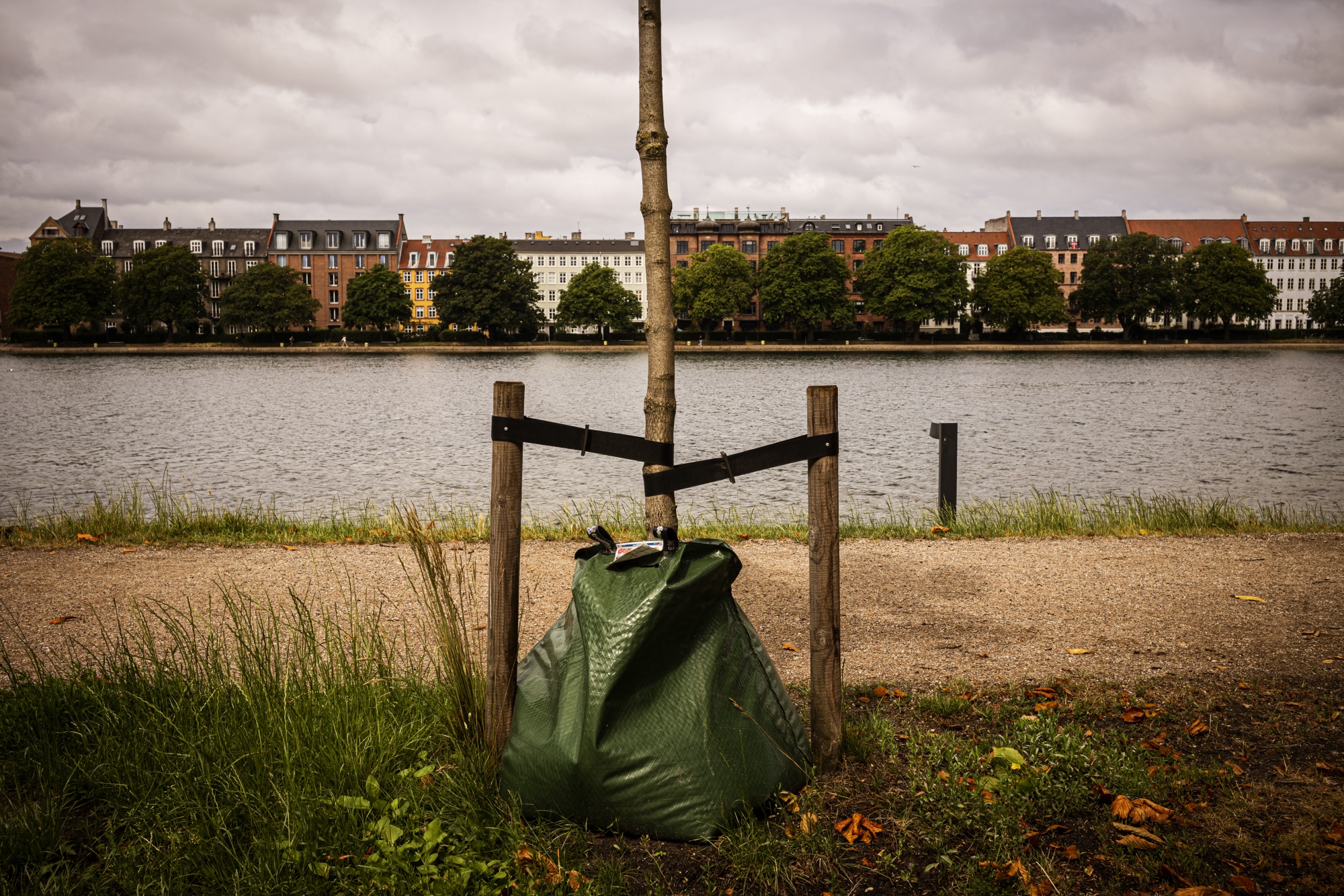 哥本哈根的一棵年轻树,于7月1日。水袋和支撑物有助于增加其成熟的机会,那时它实际上会开始为城市带来好处。