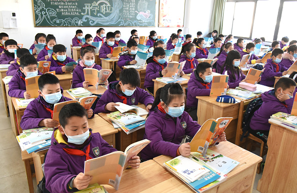 中国连云港,2月21日,新学期的第一天,小学生们。