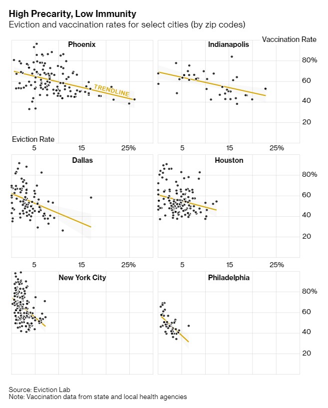 “在疫情期间,那些驱逐申请最普遍的邮政编码区域,也是疫苗接种率最低的区域,”驱逐实验室研究专家艾米丽·莱默曼说。“这些地区也往往是少数族裔社区。”