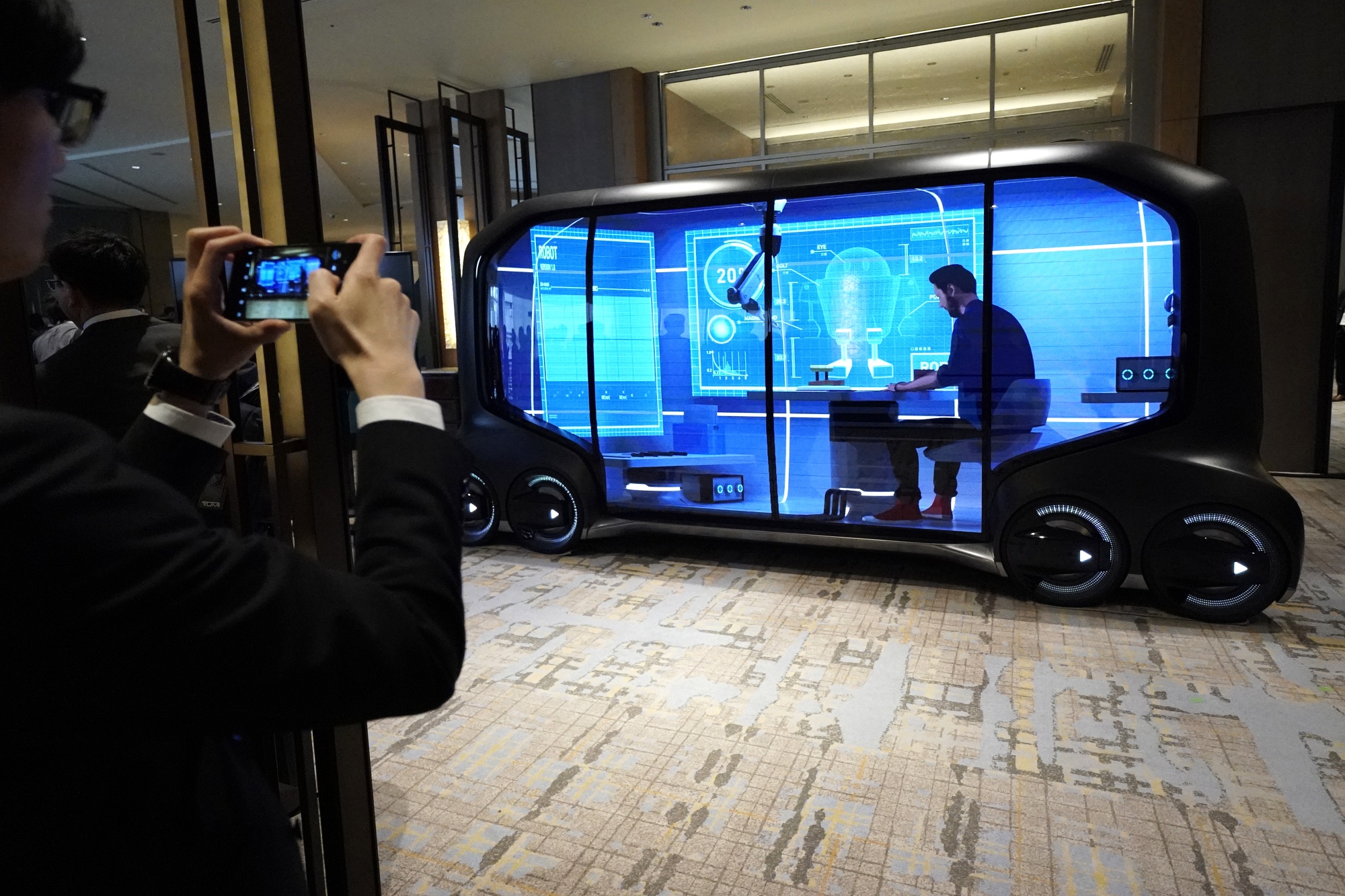 2019 年的 e-Palette 概念车。它们将来甚至可能被用作漫游办公室。摄影师:Toru Hanai/Bloomberge-Palette 还将出现在丰田正在富士山脚下建设的智能城市中。在那里,它们将在自动驾驶车道上导航,提供共享交通,递送包裹,并充当移动商店。丰田甚至表示,它认为 e-Palette 未来可以作为漫游办公室,让乘客可以工作并观看周围的世界。