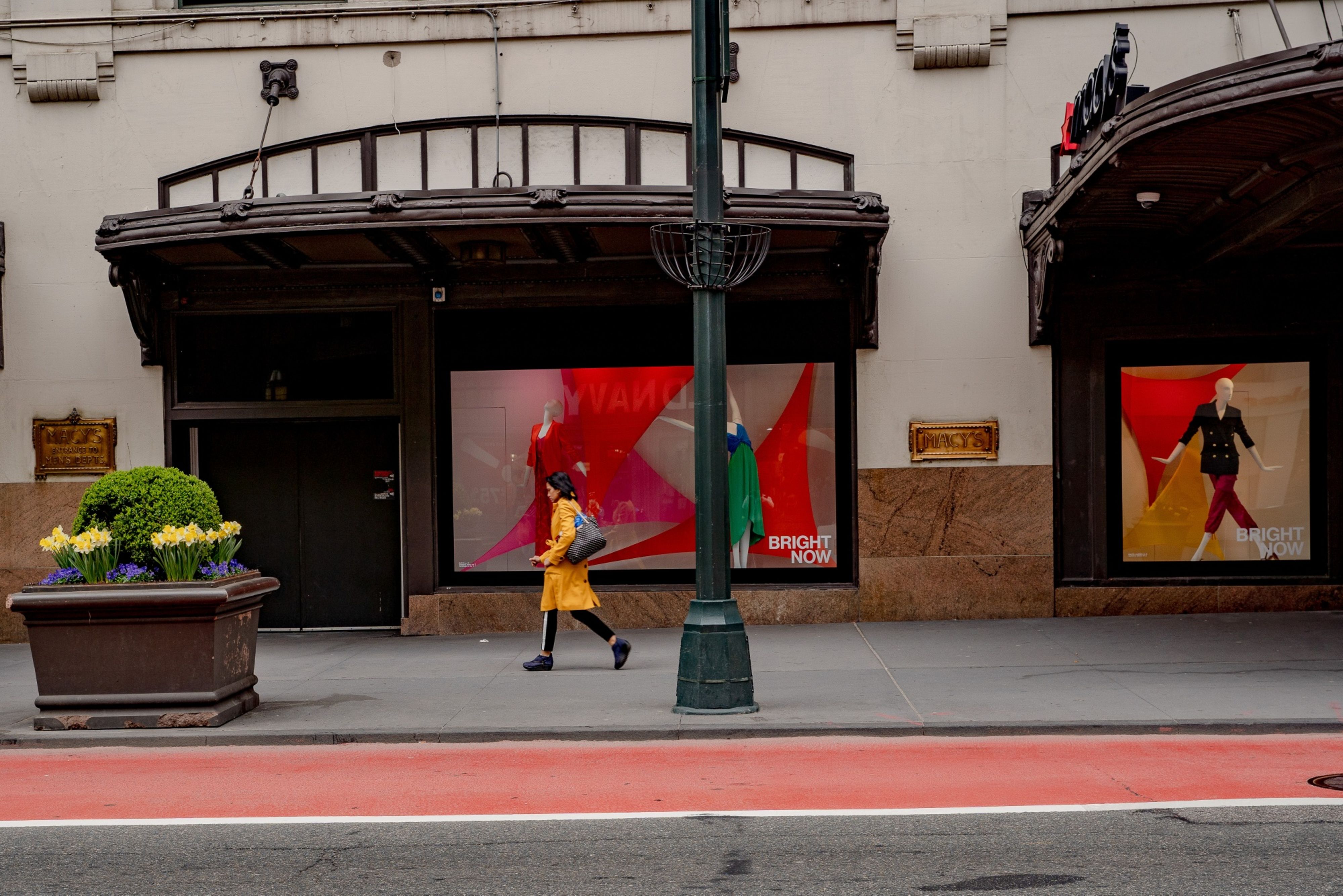 一个行人在2021年4月7日走过纽约第34街的梅西百货店。一项新研究发现,大城市中的随意社交互动可以帮助抵抗抑郁症。