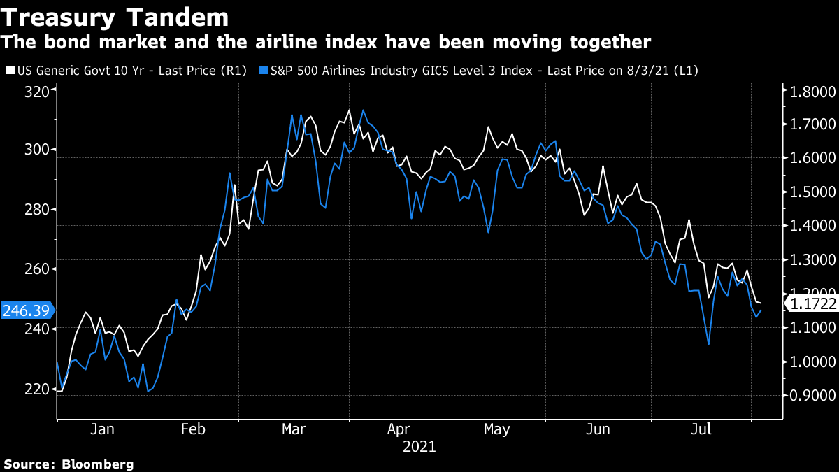 在这种时候,有时候看最简单的解释是有用的,我认为下面的图表展示了这一点。十年期国债收益率和航空股票仍然在一起波动,距离疫情爆发已经一年多了。问题是航空股票到底反映了什么?显然,它们是对新冠病毒的担忧的代理 — 随着对德尔塔变种病例传播的担忧增加,航空股票下跌。它们也可能反映了投资者对美国经济整体走向的定价,因为航空公司往往是最具周期性的股票。