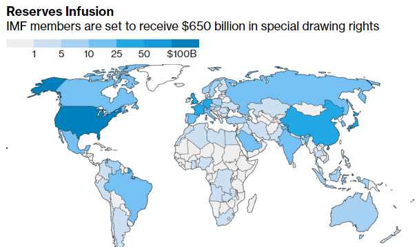 成员国批准了国际货币基金组织历史上规模最大的资源注入,总额6500亿美元,旨在帮助各国应对不断增加的债务和新冠疫情带来的影响。这些储备资产的创设——即特别提款权——是自2009年全球金融危机后发行的2500亿美元以来的首次,总裁克里斯塔琳娜·乔治耶娃将其称为“对世界的一剂强心针”,将有助于提升全球经济稳定性。