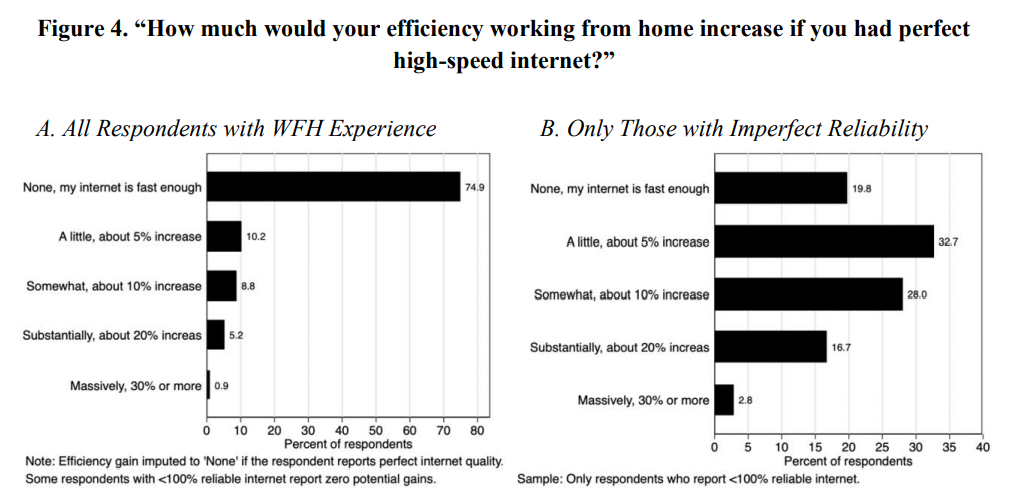 在居家办公时代,为所有美国人提供高质量、完全可靠的互联网接入,预计未来几年将使劳动生产率提高1.1%, 根据学者何塞·玛利亚·巴雷罗、尼古拉斯·布鲁姆和史蒂文·J·戴维斯的研究称,这意味着每年产出增加1600亿美元。