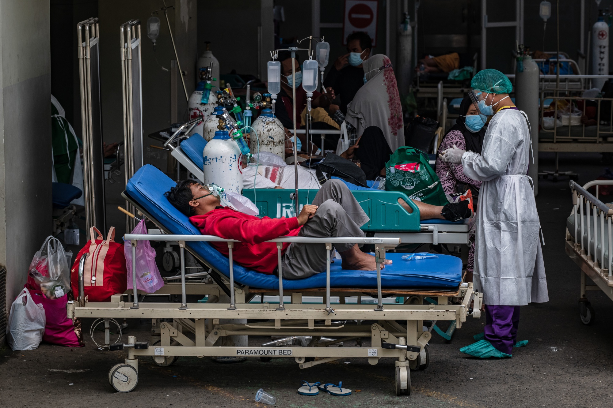 一名护士在印度尼西亚Semarang的急诊室外帮助患者,时间是7月2日。印度尼西亚已经记录下与冠状病毒相关的超过10万例死亡病例。