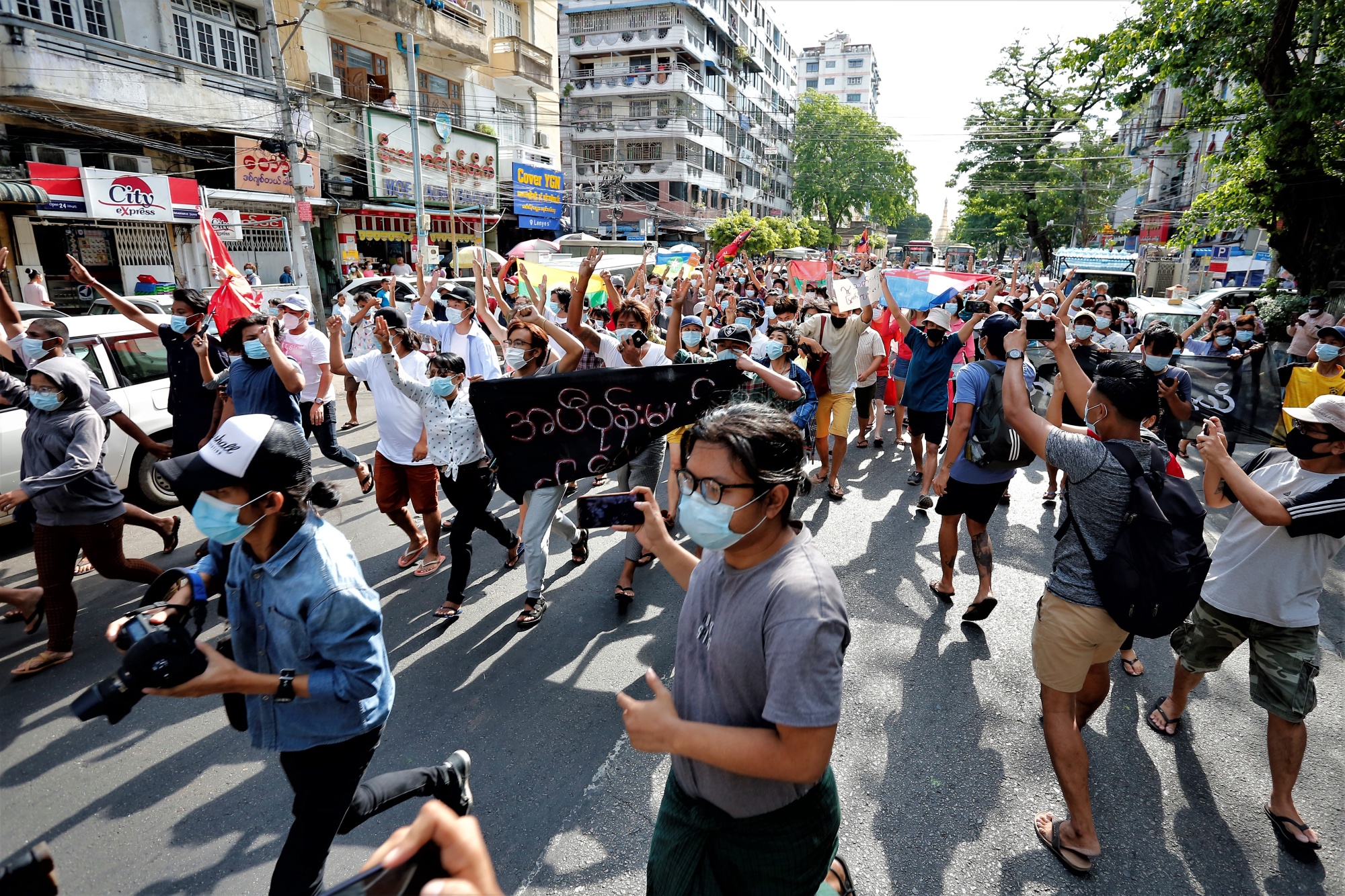 缅甸记者记录了5月6日在仰光举行的针对军事政变的快闪抗议活动。