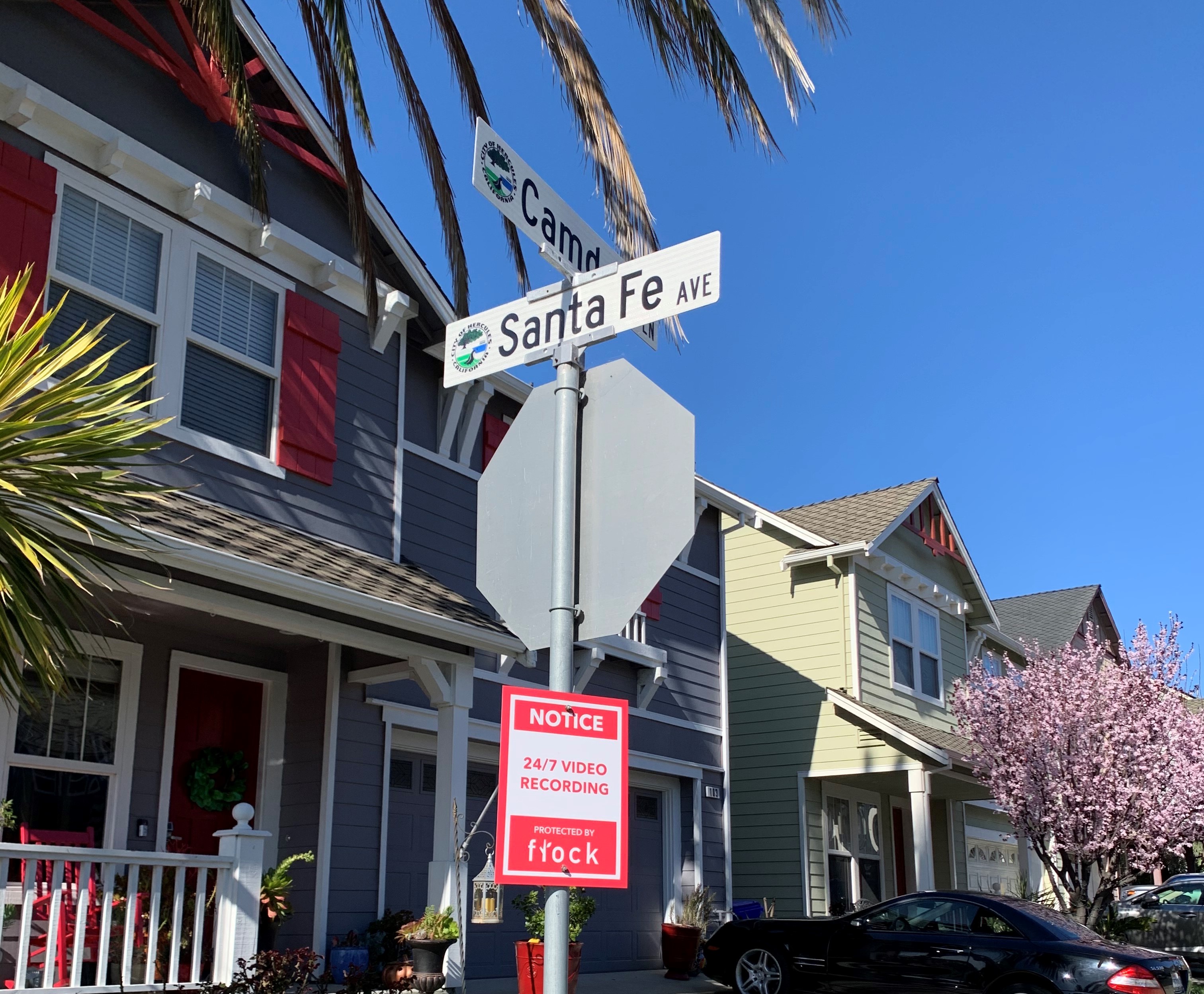 加利福尼亚北部的一个社区里,一块Flock Safety标志提醒居民和访客他们正被摄像。