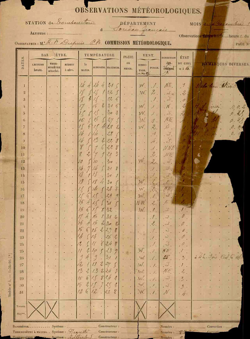 1897年的廷巴克图61223号站的天气观测报告,这是该站开始运营的那一年来源:马里气象局迪亚基特(Diakité)对廷巴克图珍贵手稿的痴迷促使他于2012年2月前往该市的艾哈迈德·巴巴研究所,该研究所正在数字化大约2万份古老文件。当时迪亚基特并不知道,他是最后一位在叛乱分子接管该市之前从廷巴克图以外前来看手稿的研究人员之一。回到法国后,他在电视上看到该市被接管的消息。他从伊斯兰激进分子的胜利到宗教陵墓的毁坏,从恐怖组织焚烧手稿的毁灭性消息,再到廷巴克图长期保管者拯救了许多手稿的报道,一直关注着这个故事,后来得知他们要么将手稿藏在城市里,要么将它们走私到巴马科。