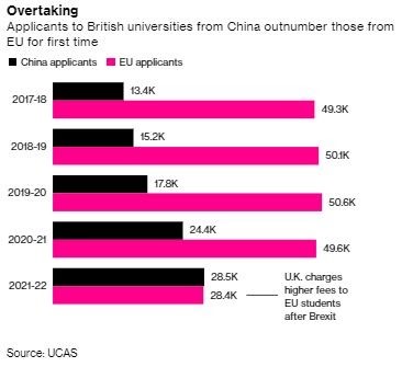 脱欧对英国大学的影响在英国大学申请人数中,中国申请人的数量首次超过欧盟申请人的总数,根据招生服务UCAS的数据。尽管如此,这并不是一个财务问题,因为国际学生的学费高于本国学生。