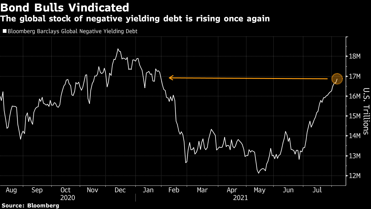 特别是欧洲,债务池中的债券收益率已经降至零以下,正如彭博社的詹姆斯·平井本周报道的那样。德国10年期债券收益率在7月份下跌了最多,跌至-0.46%。通胀交易的日子似乎已经成为遥远的记忆,而事实上,就在几个月前,这还是风靡一时的。