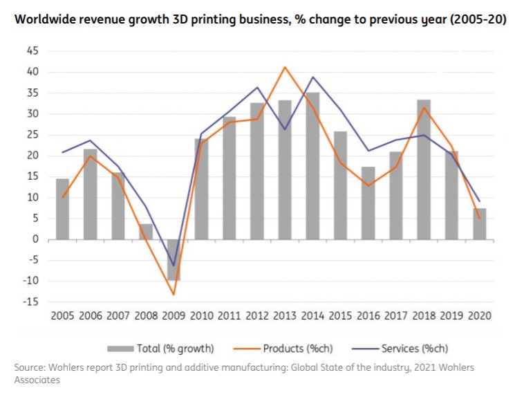 3D打印——半个世纪前被誉为革命生产手段——2020年全球收入仅为128亿美元,占全球制造增值的0.1%,ING国际贸易分析主管劳尔·利林在一份报告中写道。
