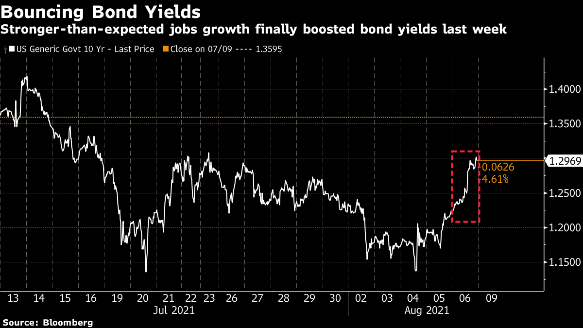 一份惊人的就业报告最终成功地使美国国债收益率活跃起来,标准的10年期国债在本周早些时候跌至1.12%后上涨至1.3%以上。7月新增了943,000个工作岗位 — 远远超过预期的870,000个 — 这意味着我们明显更接近美联储在就业市场上实现“实质性”进展的目标。