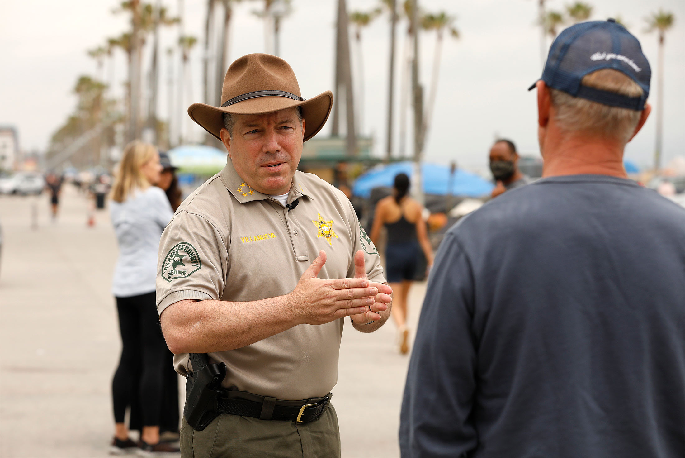 加剧这些恐惧,洛杉矶郡警长维拉努埃瓦于6月抵达威尼斯,打击滨海长廊上的“无政府状态”,尽管该地区在技术上属于洛杉矶警察局的辖区。他通过骑马巡逻和煽动性的新闻发布会加剧了紧张局势,包括在6月23日的一次活动中,他指责了“无家可归产业复合体”。