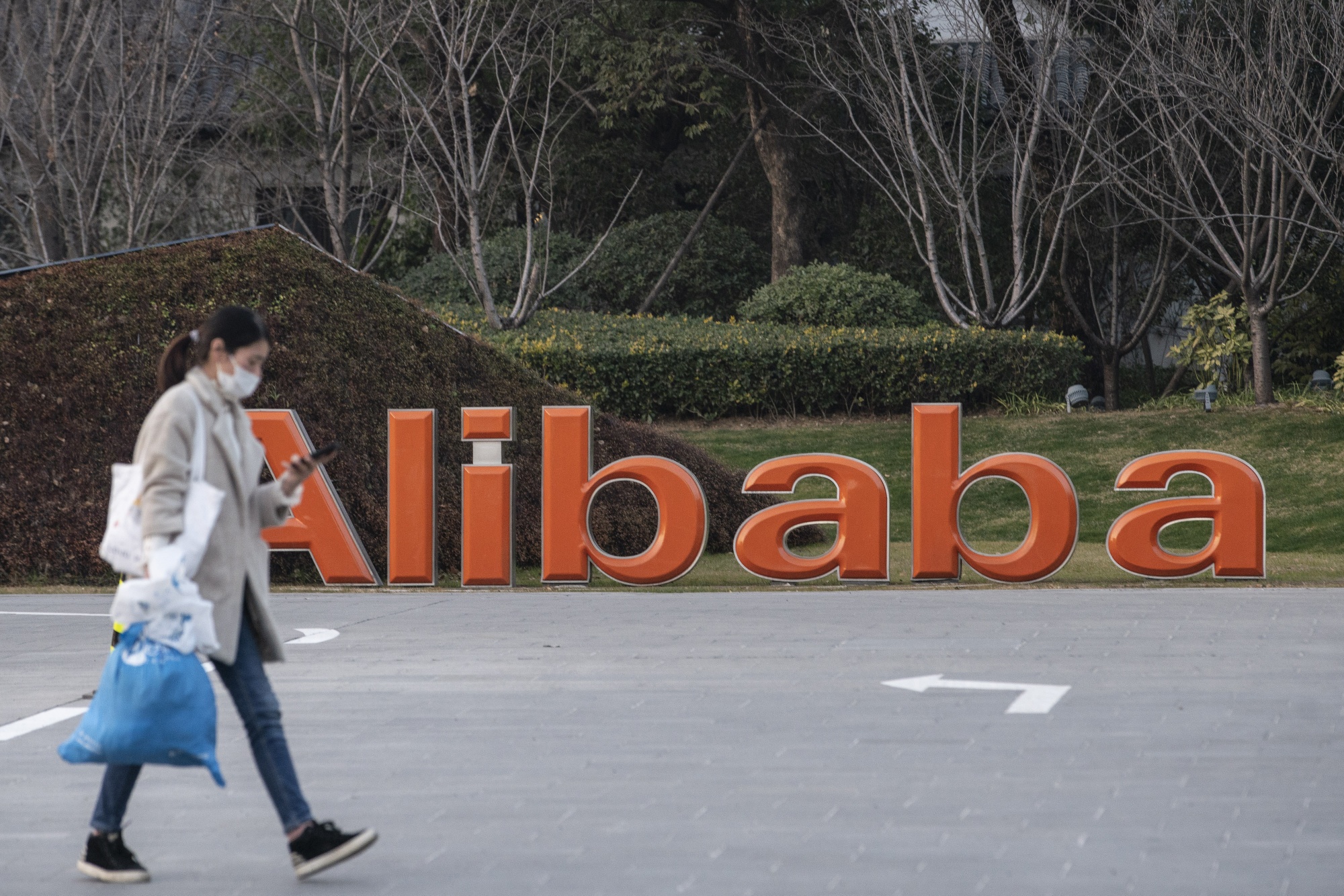 一名女子走过中国杭州阿里巴巴集团总部外的标志。