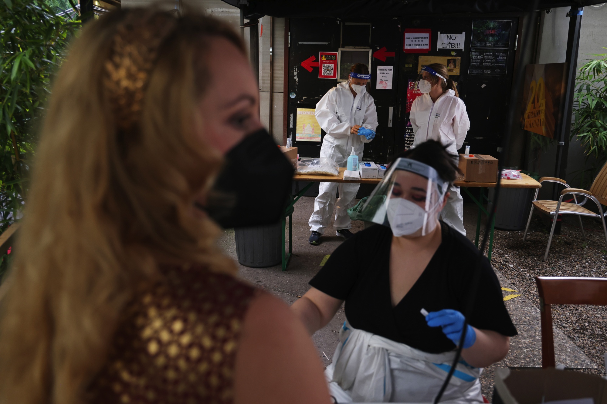 在柏林的KiKat Club外,夜店爱好者排队接受新冠病毒检测,准备参加“夜店文化重启”活动,时间是8月6日。摄影师:Sean Gallup/Getty Images