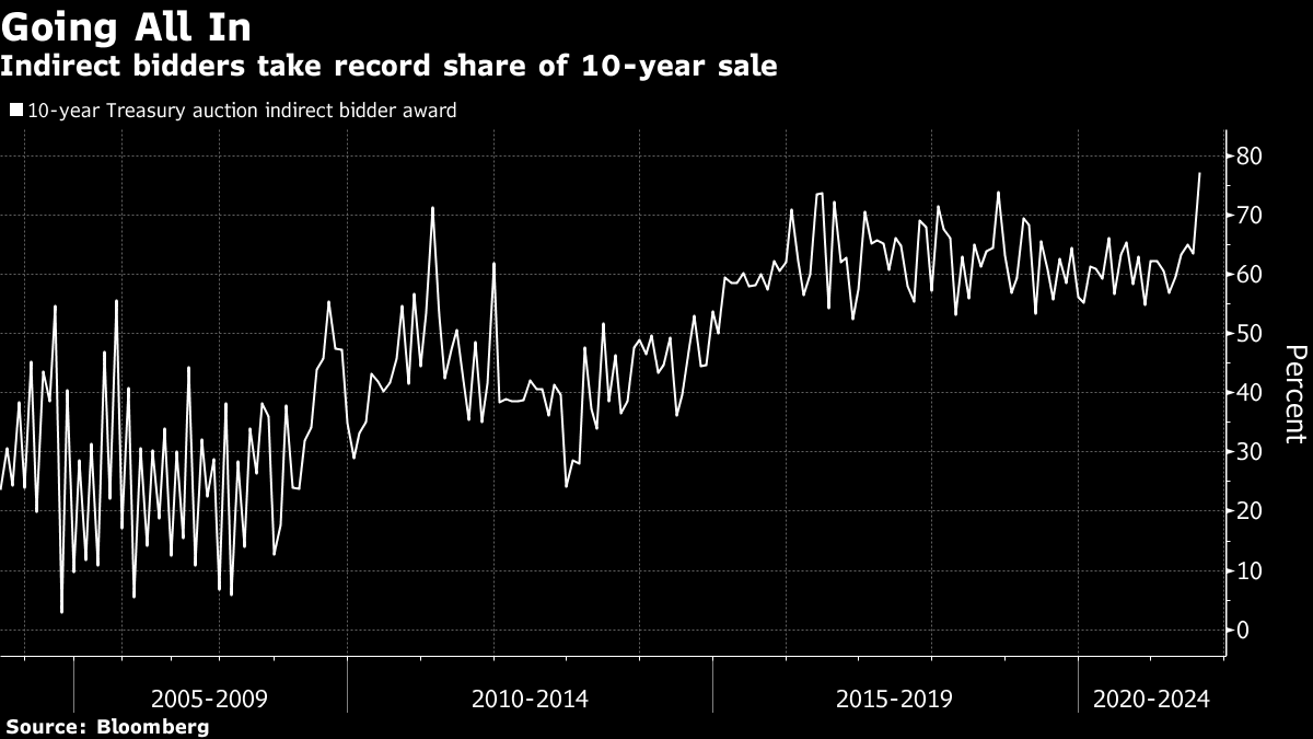 周三10年期国债拍卖的强劲表现是如此出乎意料,以至于引发了许多人的困惑和几种理论。让我们从间接竞标者接受开始,这一类别被广泛视为外国央行购买的代理。正如彭博的另一位编辑史蒂芬·斯普拉特(Stephen Spratt)所指出的,美联储的外国和国际货币当局(FIMA)回购设施在仅仅两周前才正式设立。