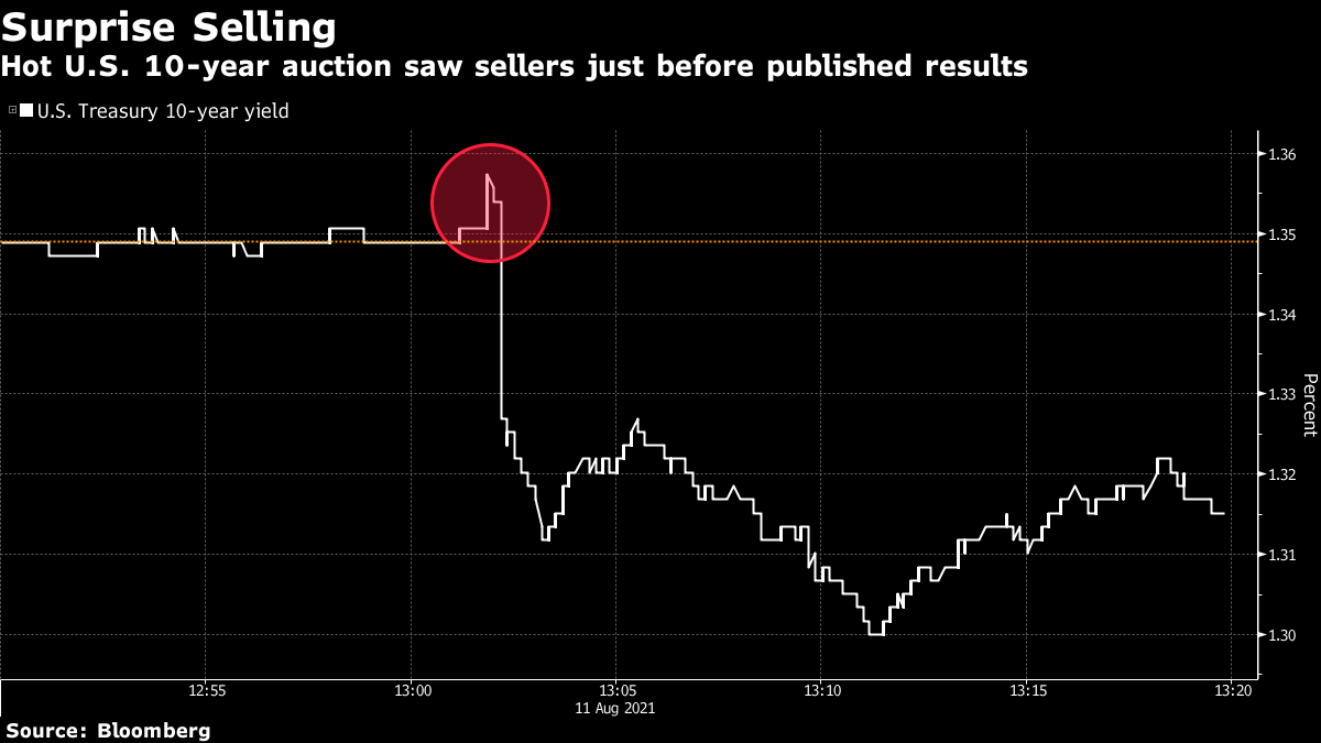 但是拍卖后的激烈上涨增加了神秘感,随着下午收益率暴跌多达5个基点。彭博社的爱德华·博林布鲁克在结果公布前几秒钟内分析了价格走势,并发现了大量的抛售行为。根据彭博社的“报价回顾”功能: