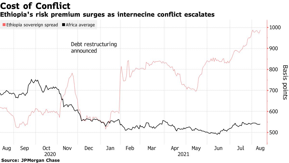 埃塞俄比亚美元债务的风险溢价今年几乎翻了一番,因为该国北部提格雷地区的战斗蔓延到邻近的阿姆哈拉和阿法尔省。这场冲突给非洲第二人口大国的商业前景蒙上了阴影。