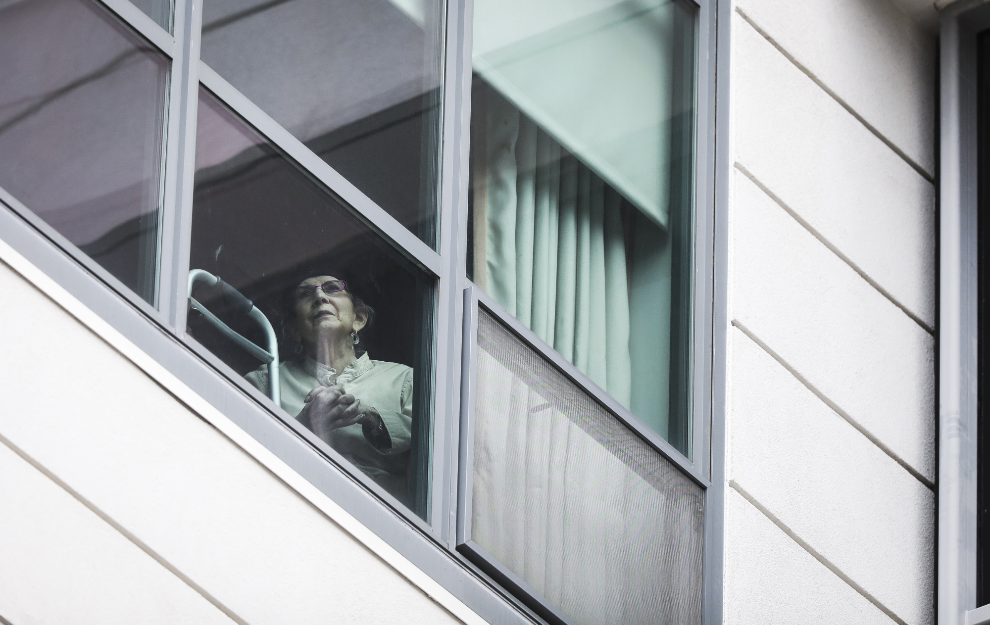 波士顿的莱昂纳德·弗洛伦斯生活中心的居民从窗户观看表演。