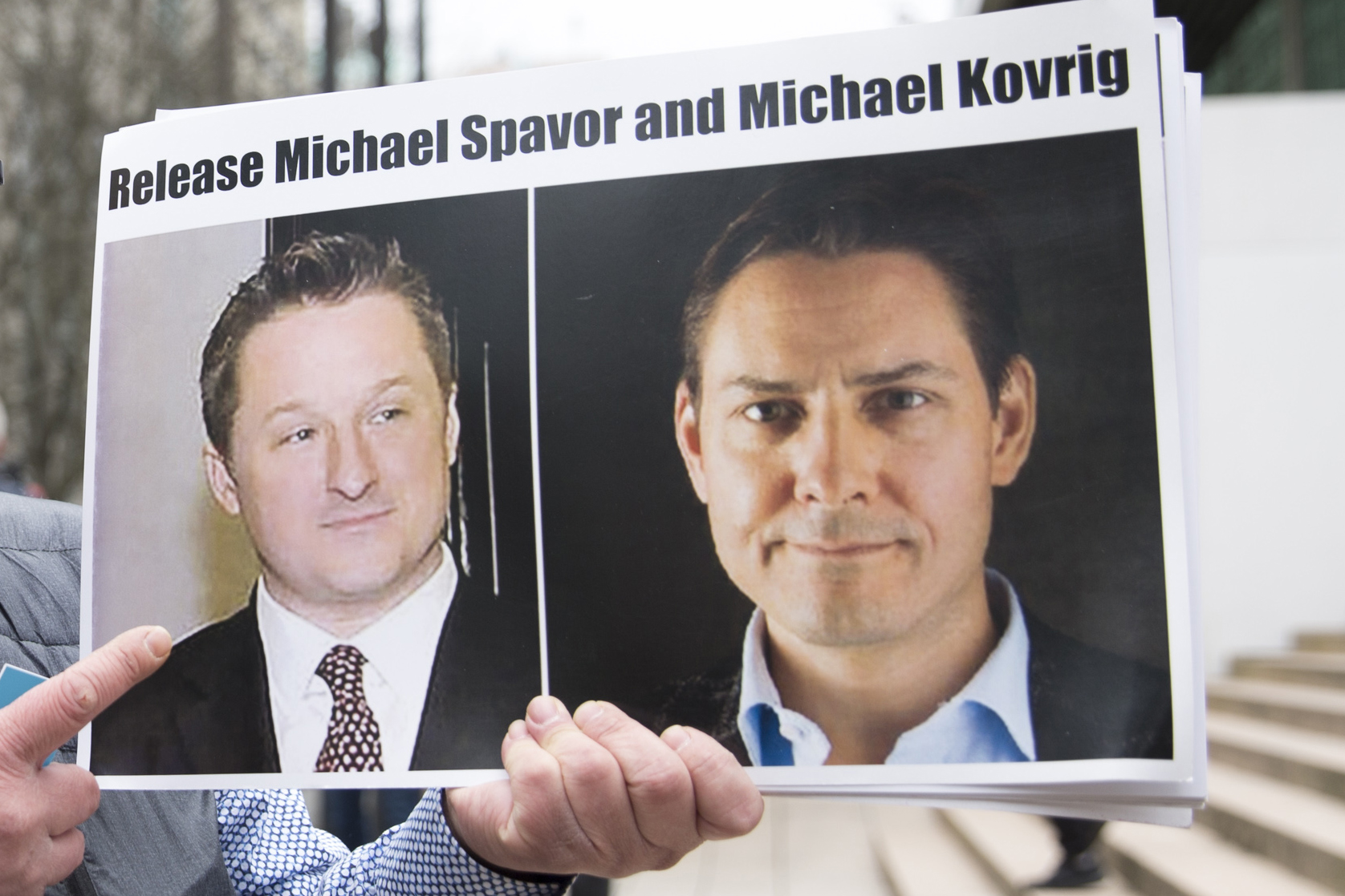 温哥华自由与中国民主协会的路易斯·黄在2019年3月6日在不列颠哥伦比亚省最高法院外展示迈克尔·斯帕弗和迈克尔·科夫里格的照片,当时正在审理华为首席财务官孟晚舟的引渡程序。摄影师:杰森·雷德蒙德/法新社加拿大总理贾斯汀·特鲁多谴责这些行动是武断的。中国驻加拿大大使馆回应称“根本不存在‘武断拘留’”。