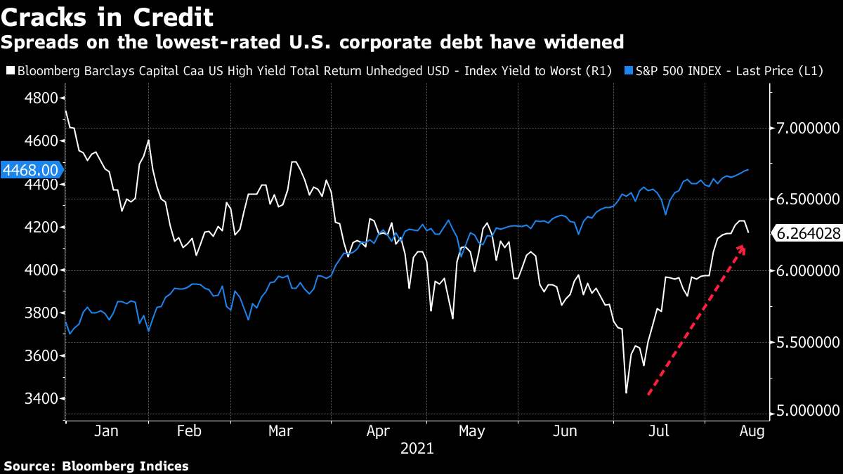 发生了什么?巴克莱的信贷分析师Brad Rogoff表示,受Covid影响最严重的公司发行的债券表现不佳。(尽管值得指出的是,能源发行人——CCC评级桶的一个重要组成部分——也受到低油价的拖累)。随着对Delta变种的担忧加剧,投资者重新评估购买受疫情影响最严重公司发行的债券所获得的微薄回报是有道理的。