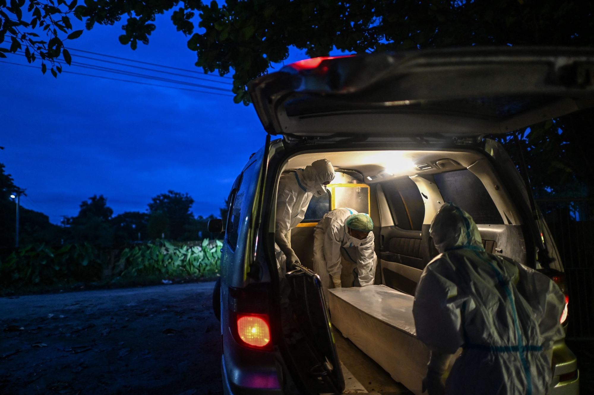 志愿者在缅甸巴戈地区于8月6日准备好一个空棺材,然后去接走一名疑似新冠病毒受害者的尸体。摄影师:Ye Aung Thu/AFP/Getty Images