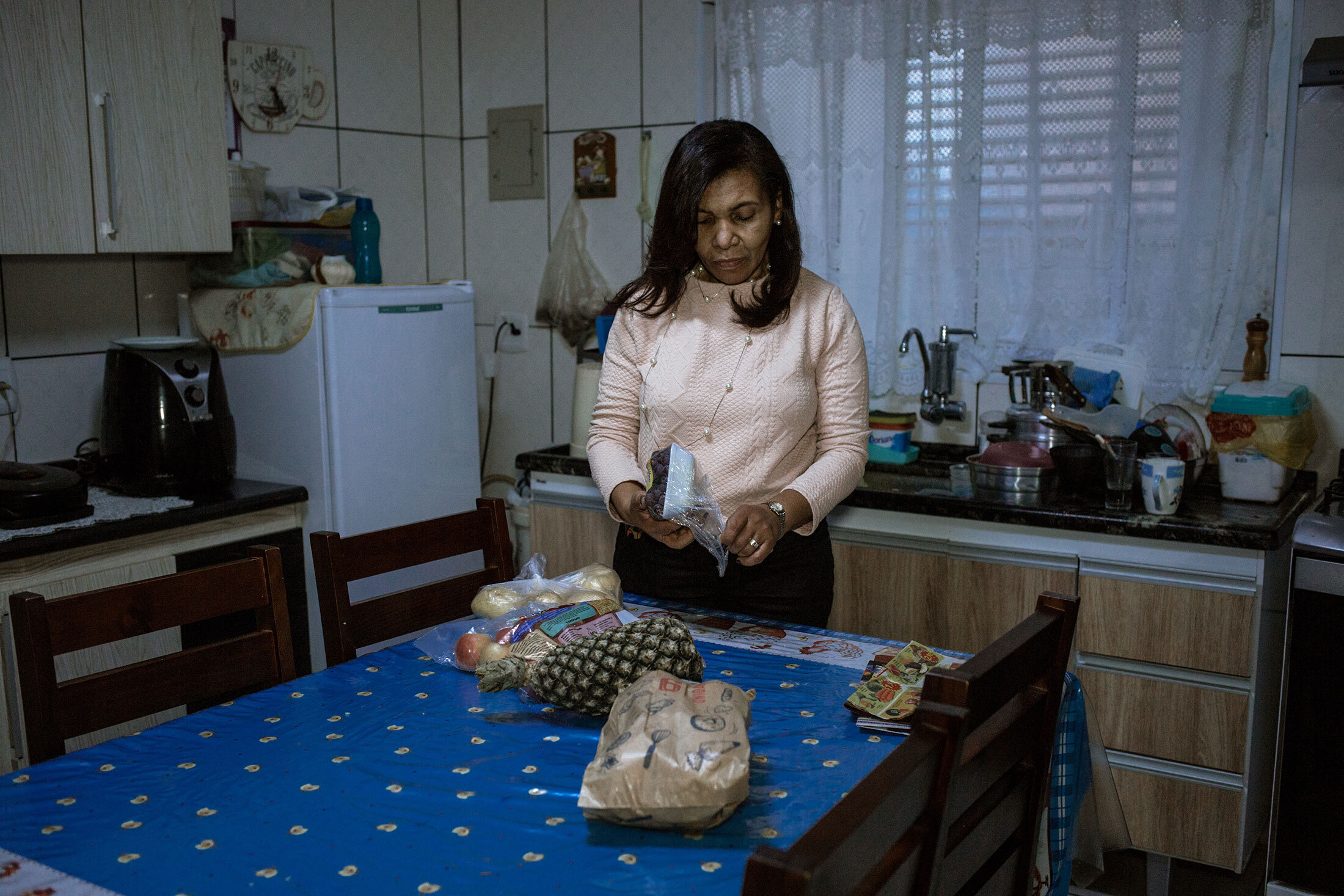 伊莎贝尔·弗朗西斯卡·特谢拉·瓦尔德西在巴西瓜鲁尔霍斯的家里整理食品杂货。
